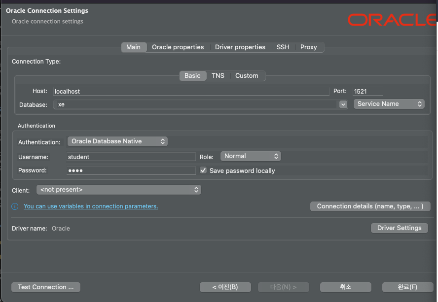 - 교육용인 무료 db를 이용하기 때문에 Database를 xe로 변경한다.
