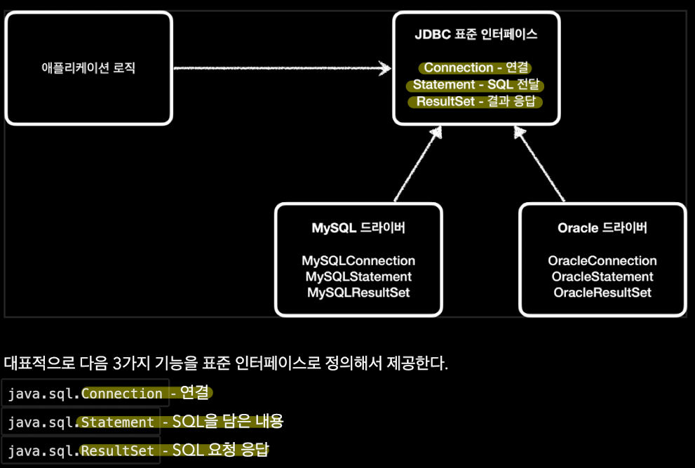 - 하나의 인터페이스가 아니라 Connection, Statement, ResultSet이란 각각의 interface를 가지고 있는 것을 JDBC 표준 인터페이스라고 한다.