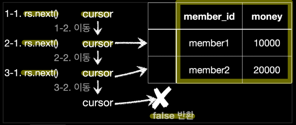 - rs.next() : 이것을 호출하면 커서가 다음으로 이동한다.