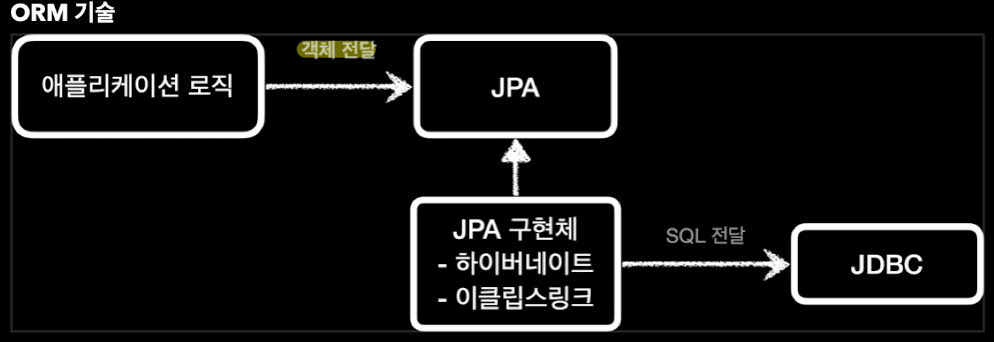 - 반복적인 SQL을 직접 작성하지 않고, ORM 기술이 개발자 대신에 sql을 동적으로 만들어 실행