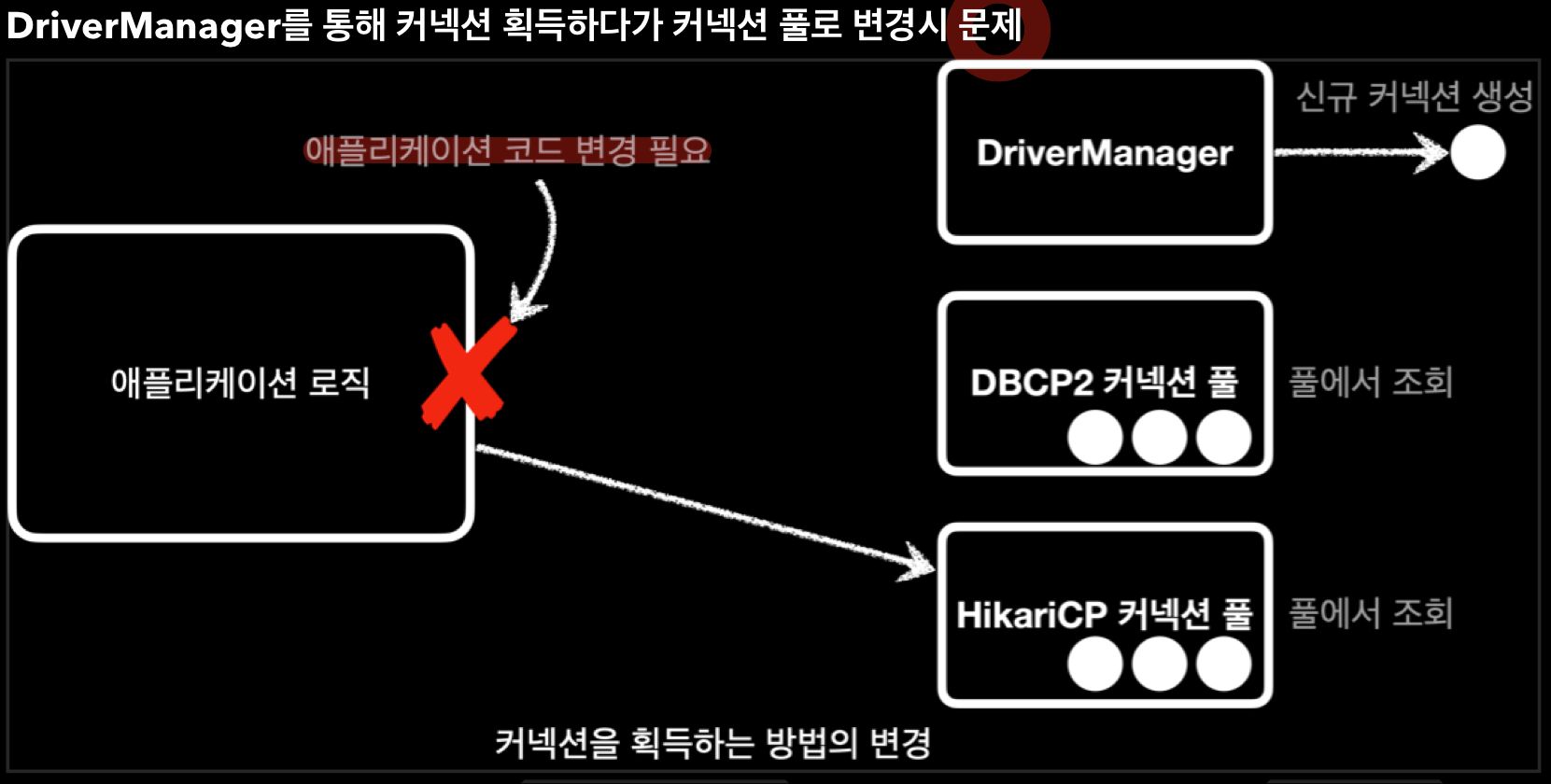 - 의존관계 때문에 DriverManager -> HIkariCP 로 변경시 app code를 건들여야되는 문제점이 발생