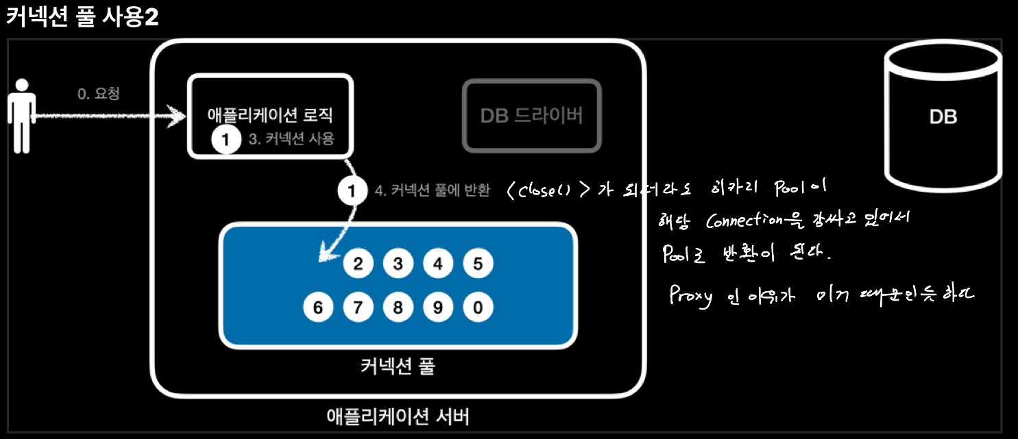 - 새로운 connection을 획득하지 않고 이미 생성되어 있는 connection을 객체 참조로 그냥 가져다 사용하면 된다.