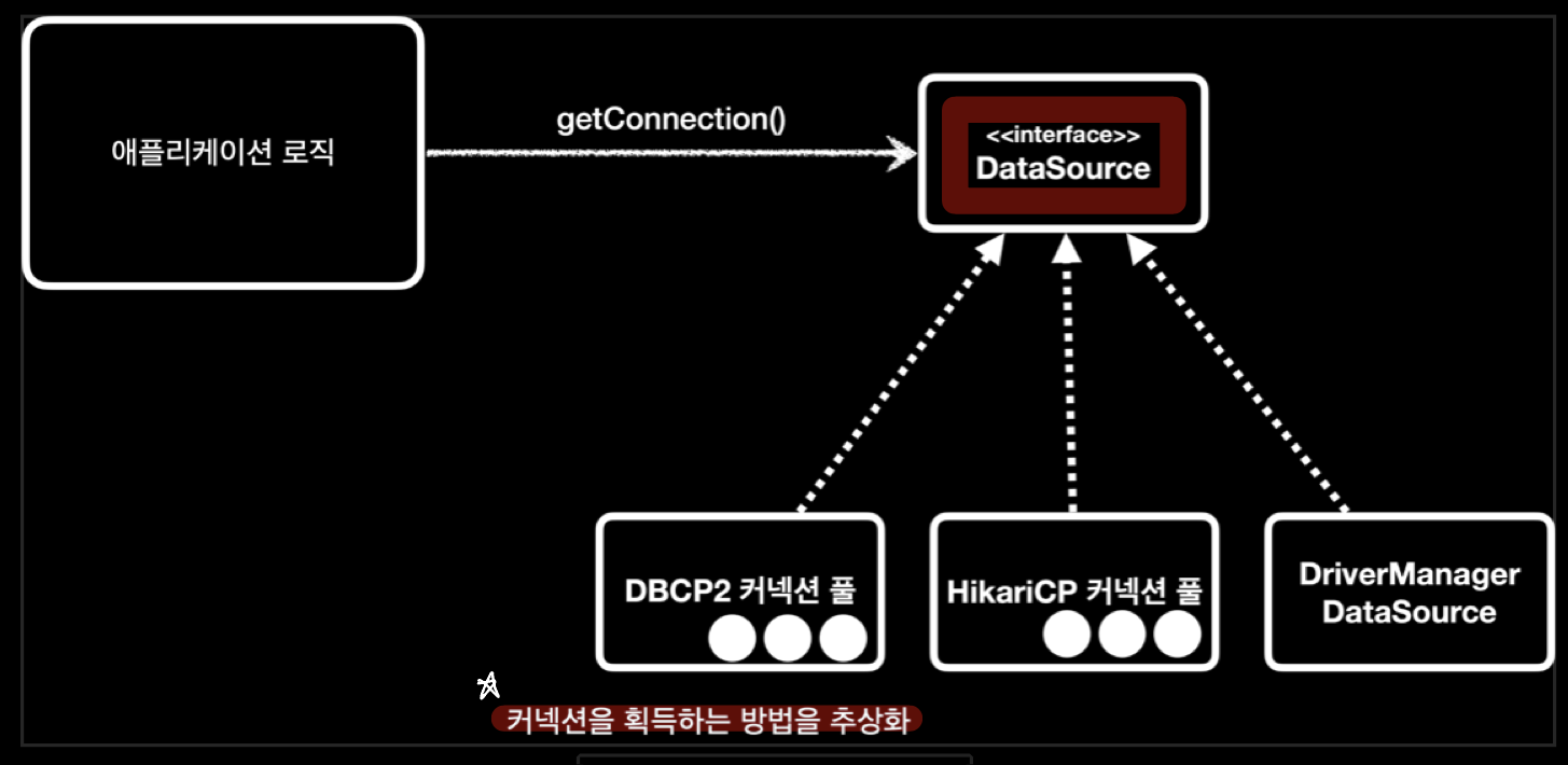 - DataSource는 connection을 획득하는 방법을 추상화 하는 인터페이스
