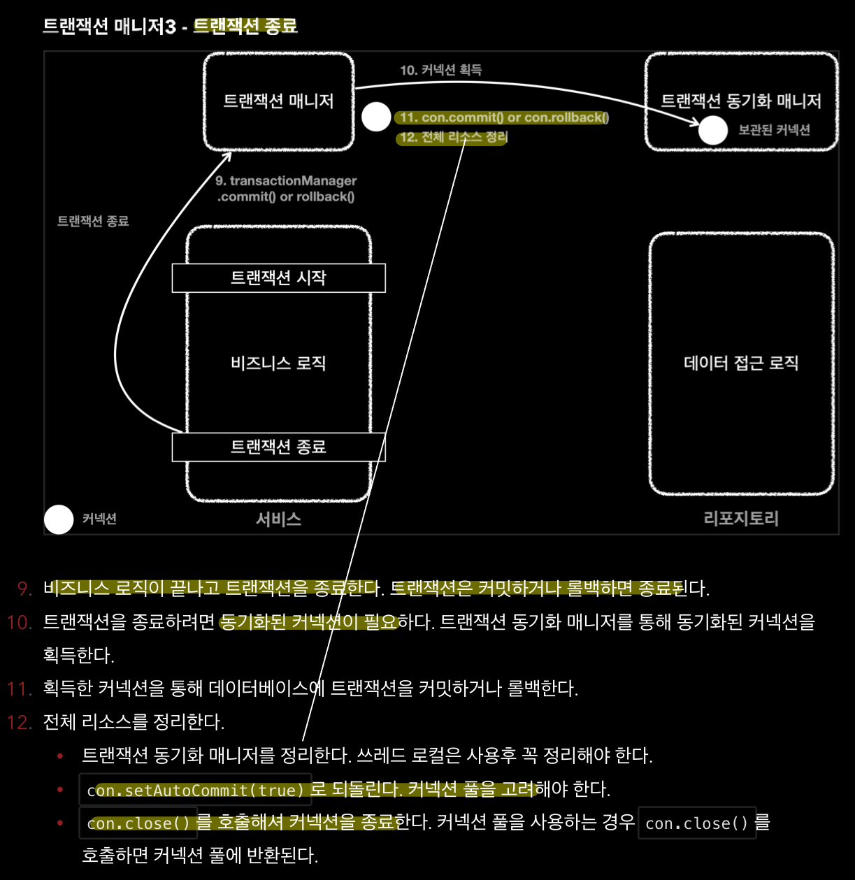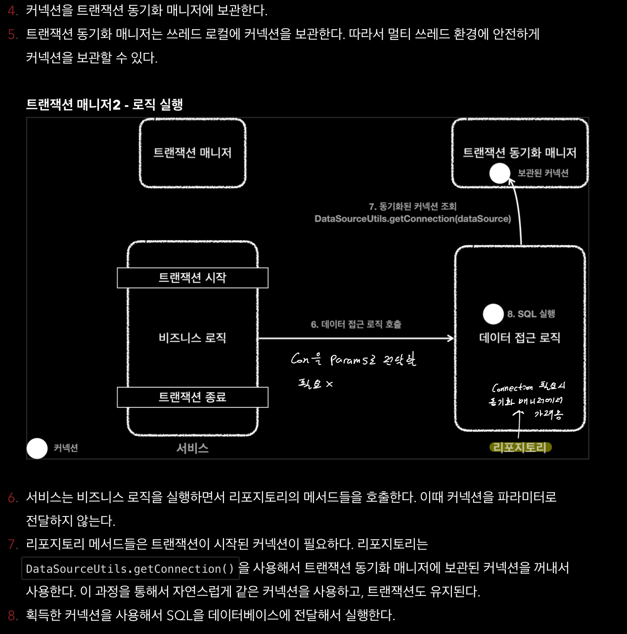 - 동일 트랜잭션 유지하기 위해 connection(con)을 params로 넘겼다.