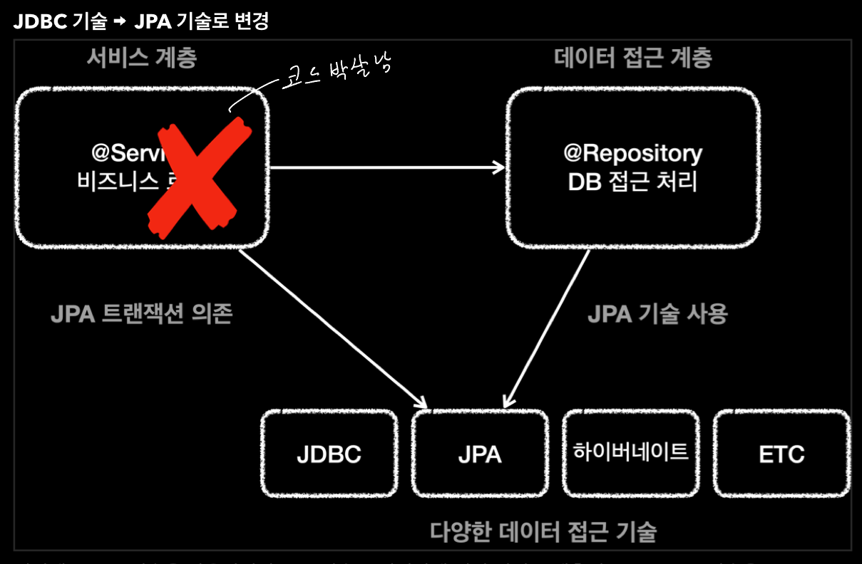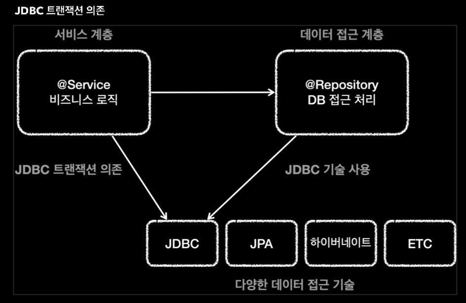 - 하지만 트랜잭션을 사용하기 위해서 DataSource, Connection, SQLException 같은 jdbc 기술에 의존한다.
