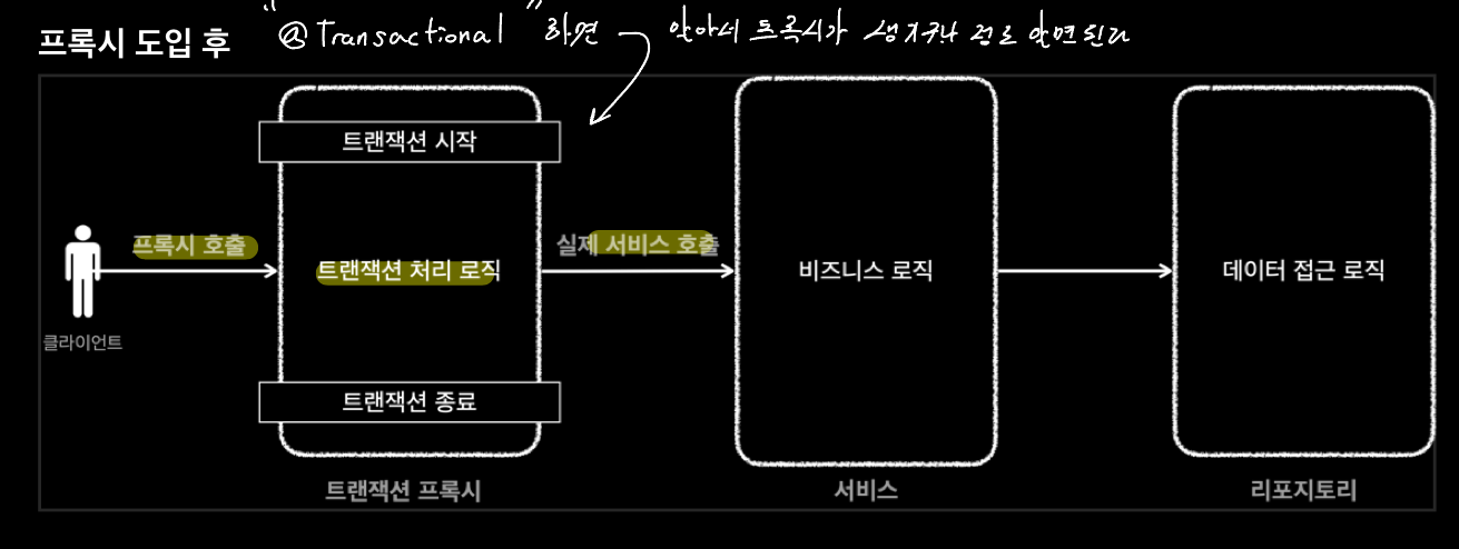 - 개발자는 트랜잭션 처리가 필요한 곳에 @Transactional 애노테이션만 붙여주면 된다.