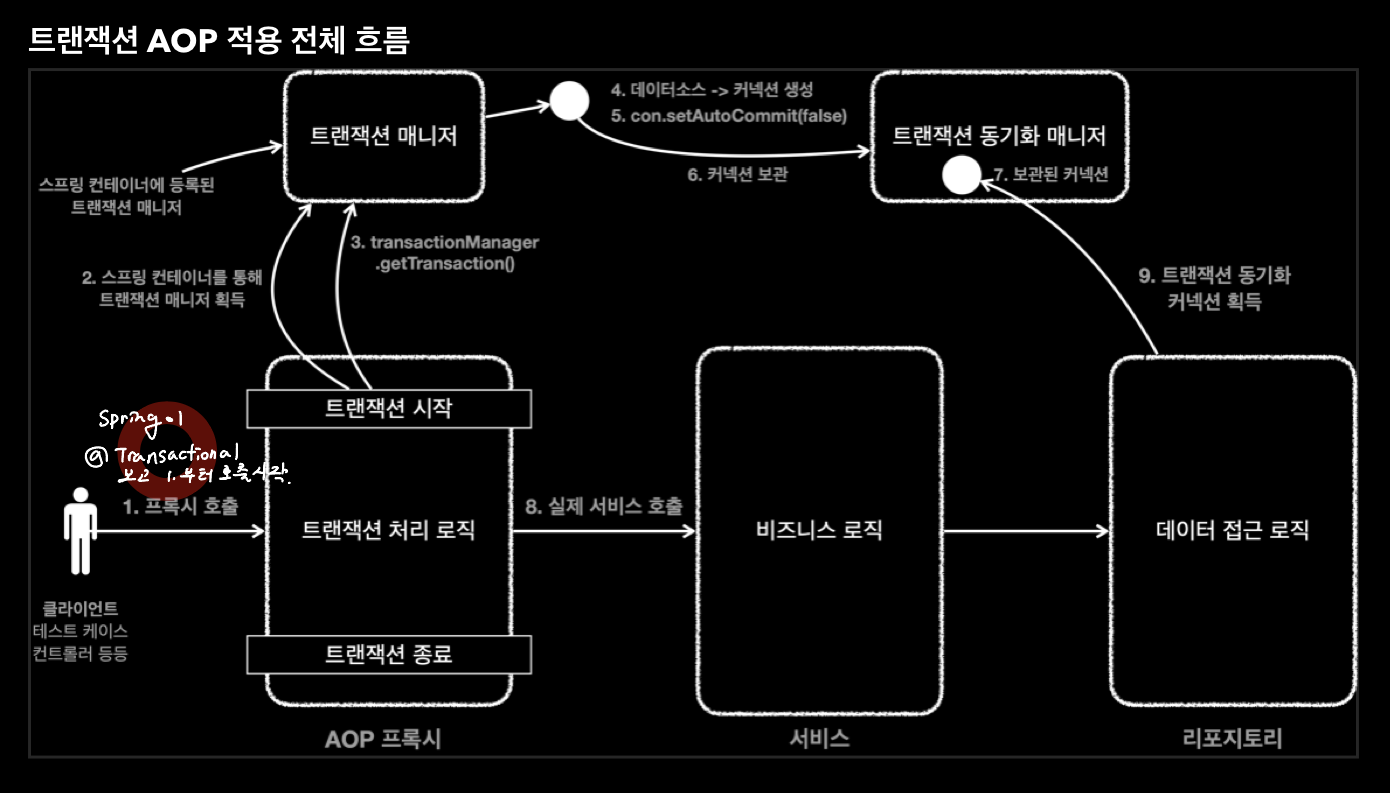 - 스프링은 트랜잭션 AOP를 처리하기 위한 모든 기능을 제공
