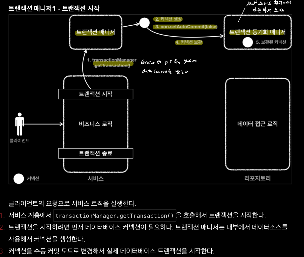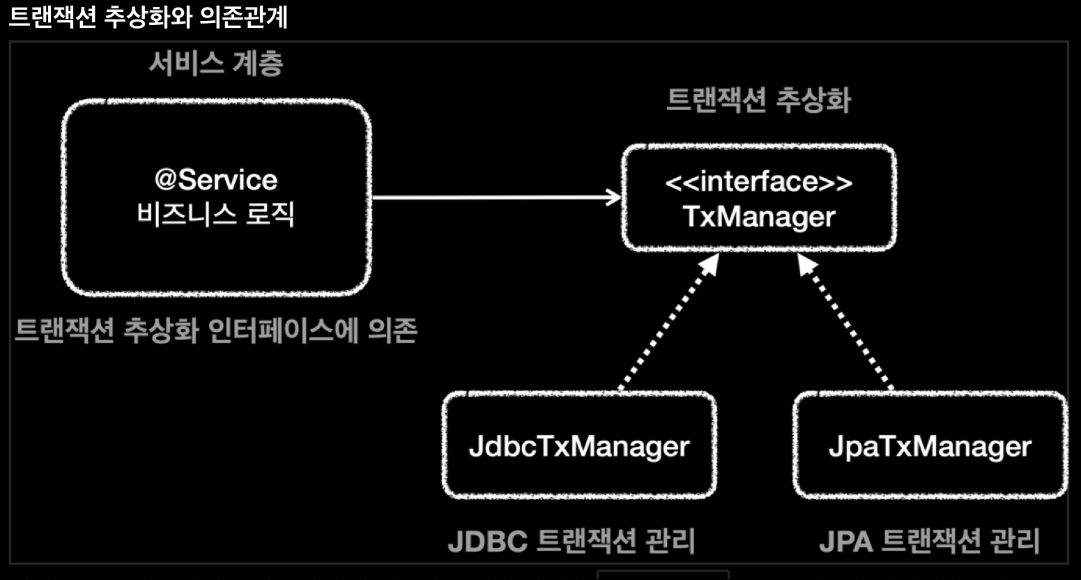 - 하지만 트랜잭션을 사용하기 위해서 DataSource, Connection, SQLException 같은 jdbc 기술에 의존한다.