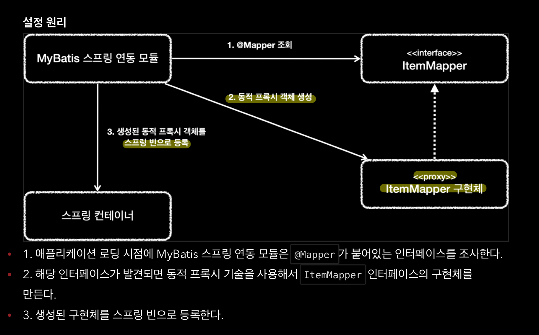 - @Mapper : MyBatis가 인식 -> xml의 해당 SQL을 실행하고 결과 돌려준다.
