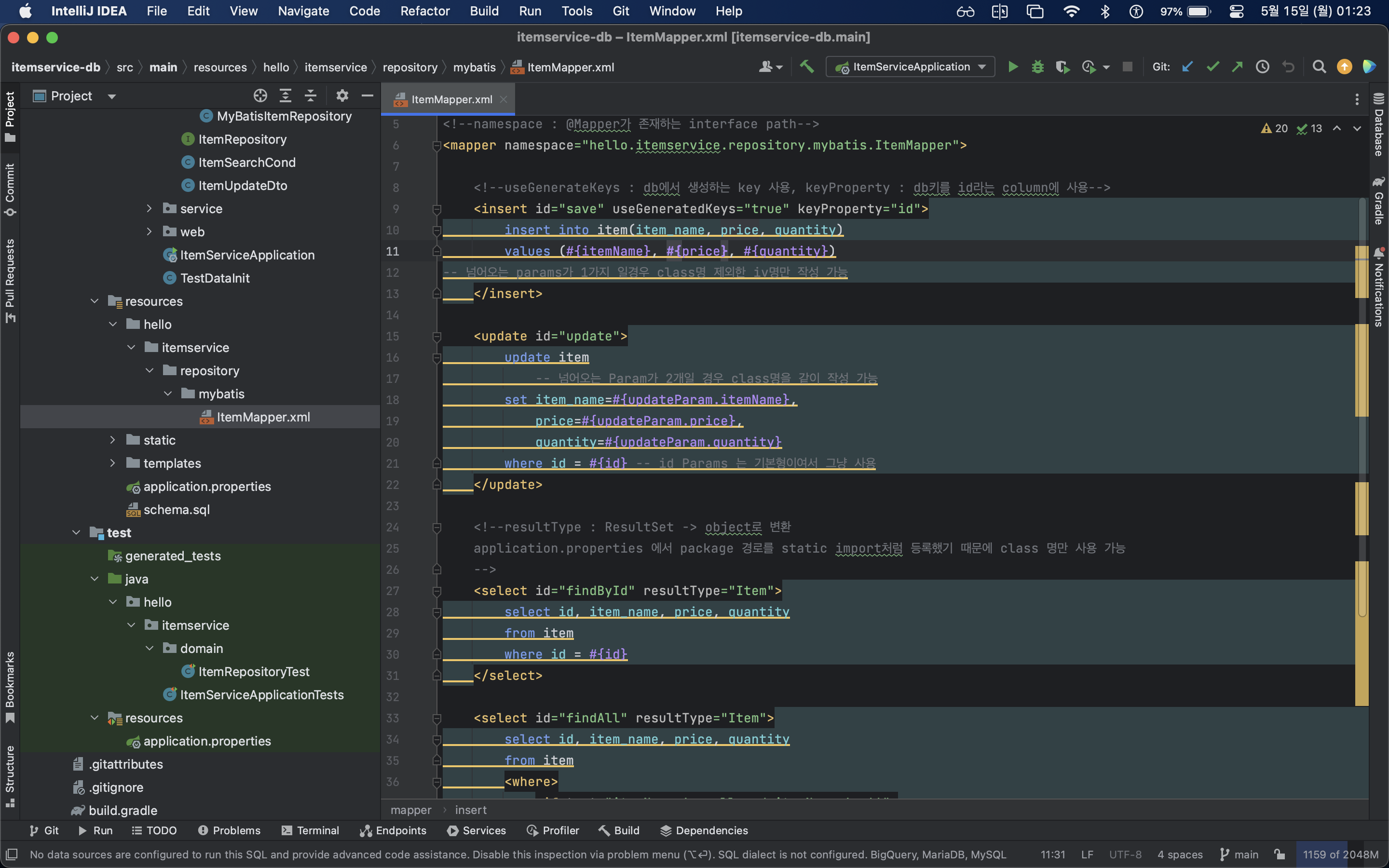 - 경로 : hello/itemservice/repository/mybatis/ItemMapper.java