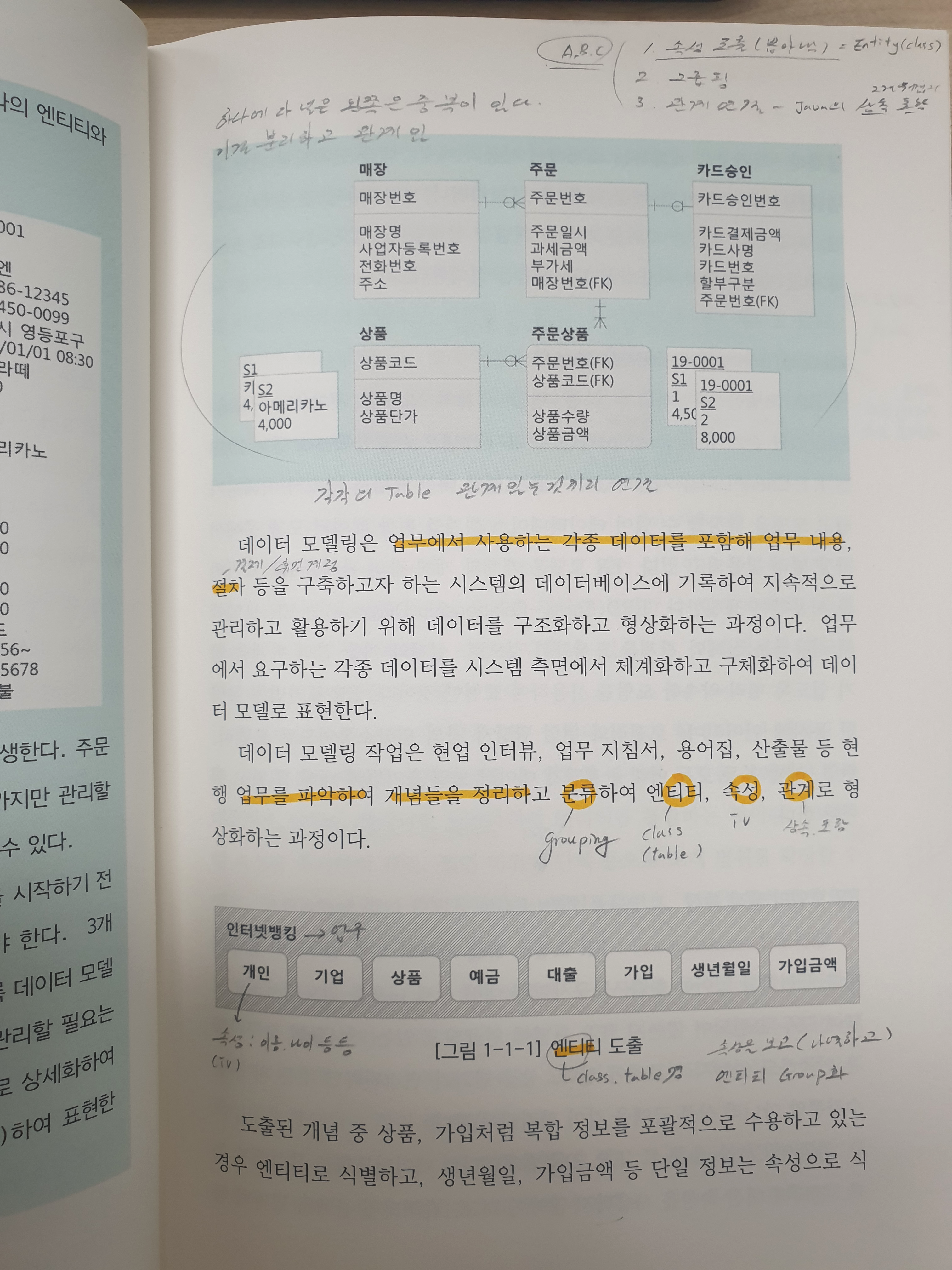- 업무를 파악하여 개념들을 정리, 분류 해서 엔티티(class), 속성(iv), 관계(상속, 포함)로 형상화