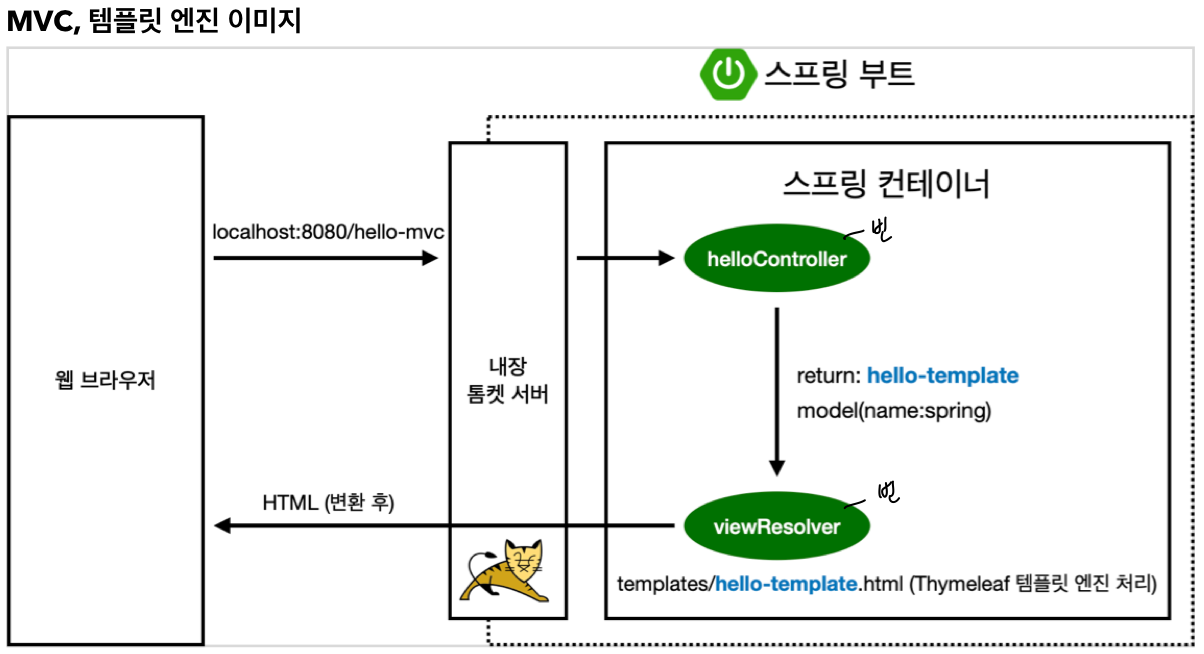 이때 controller는 먼저 spring container 내의 html file을 찾고 html엔진을 돌린후 다시 client에게 파일을 넘기는데 html 엔진이라함은 jsp, php 정도로 생각하면 된다.