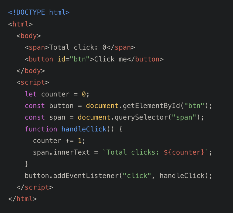 // property에 event가 존재. addEventListener, innerText같은 걸 다 생략하게 할수 있다.