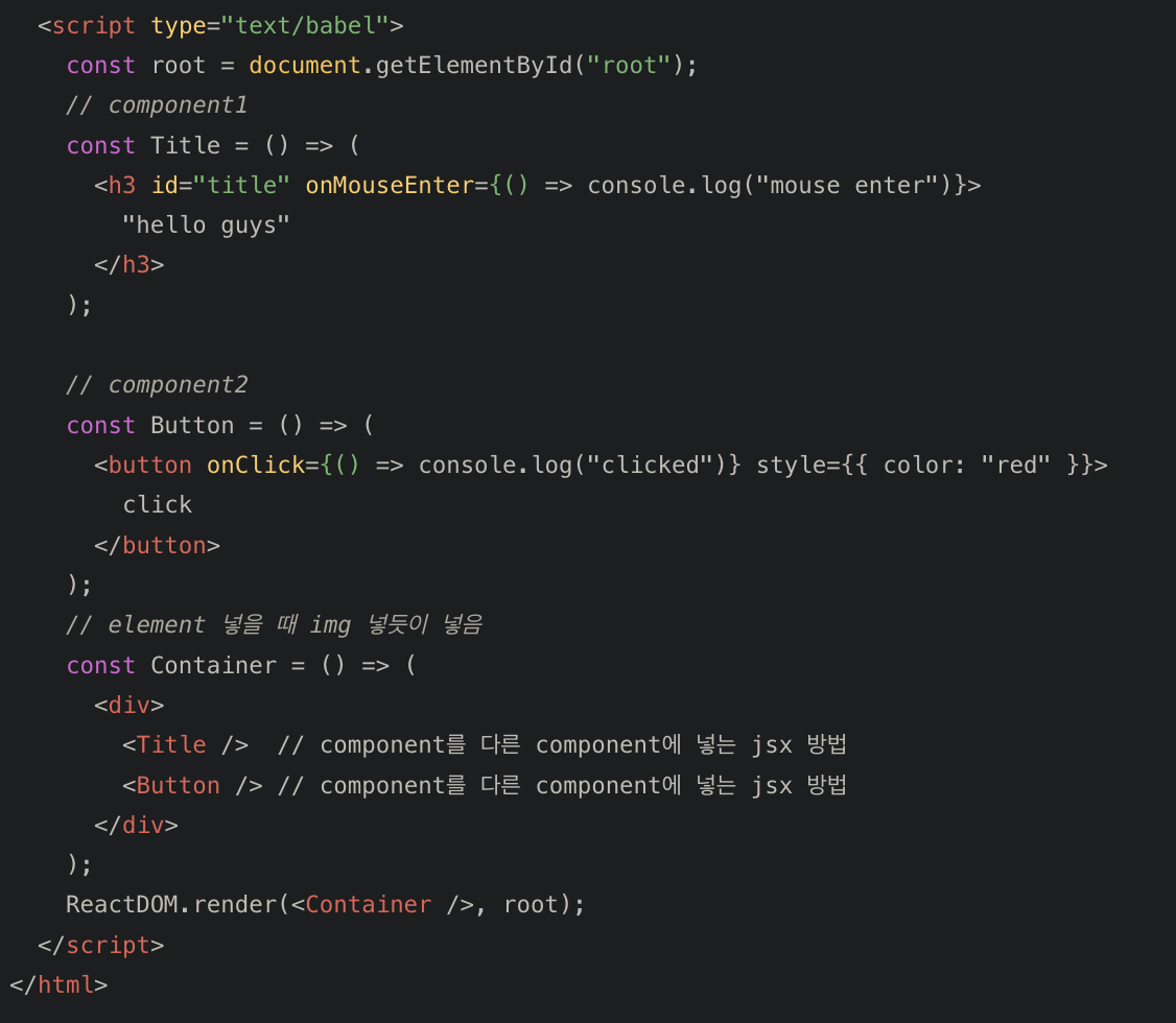 <script src="https://unpkg.com/@babel/standalone/babel.min.js"></script> - react 는 변수명을 작성할 때 첫글자를 대문자로 작성 -> component를 내부에 넣을 때 대문자로 해야지 실제 html tag와 구분이 된다