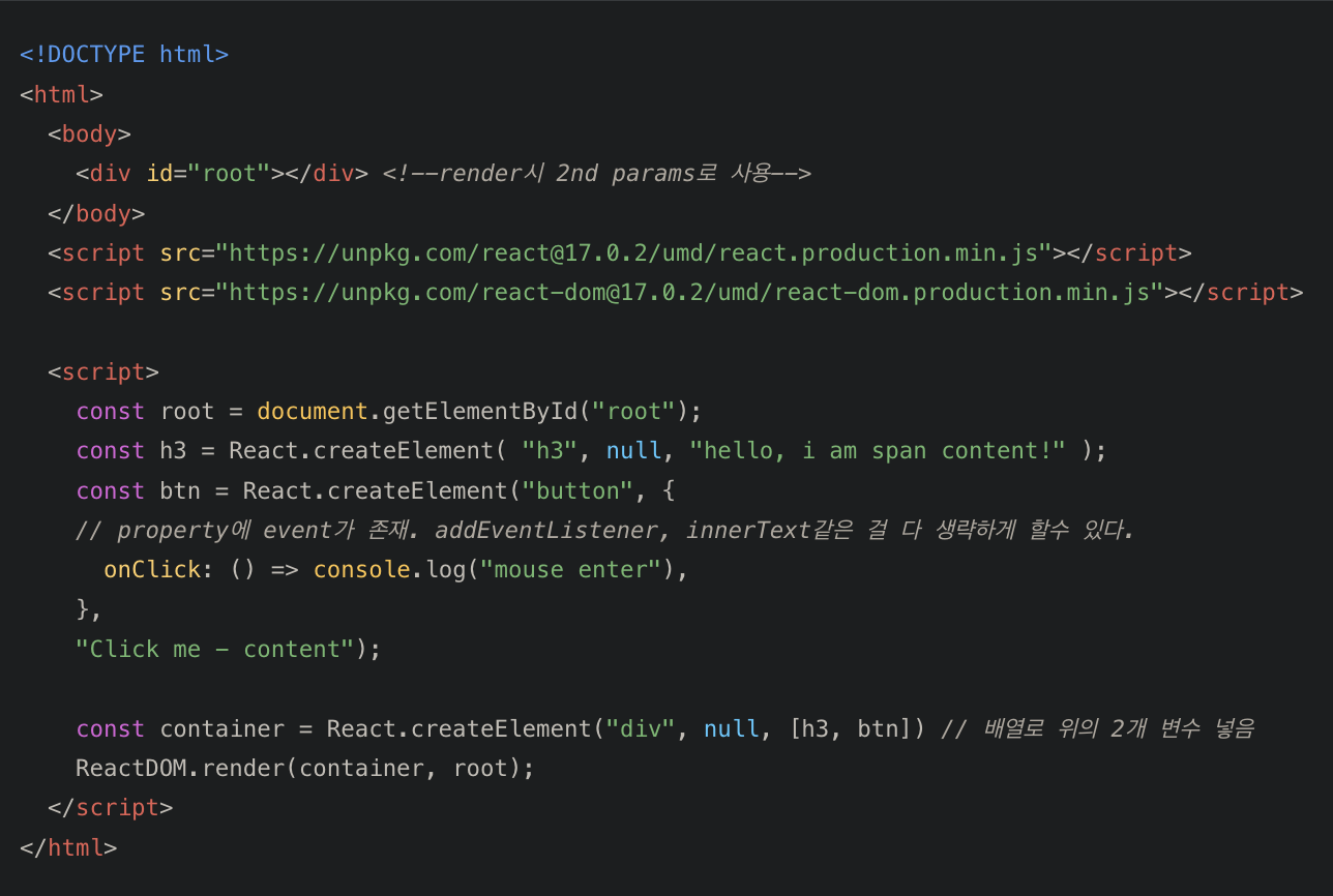 const container = React.createElement("div", null, [h3, btn]) // 배열로 위의 2개 변수 넣음
