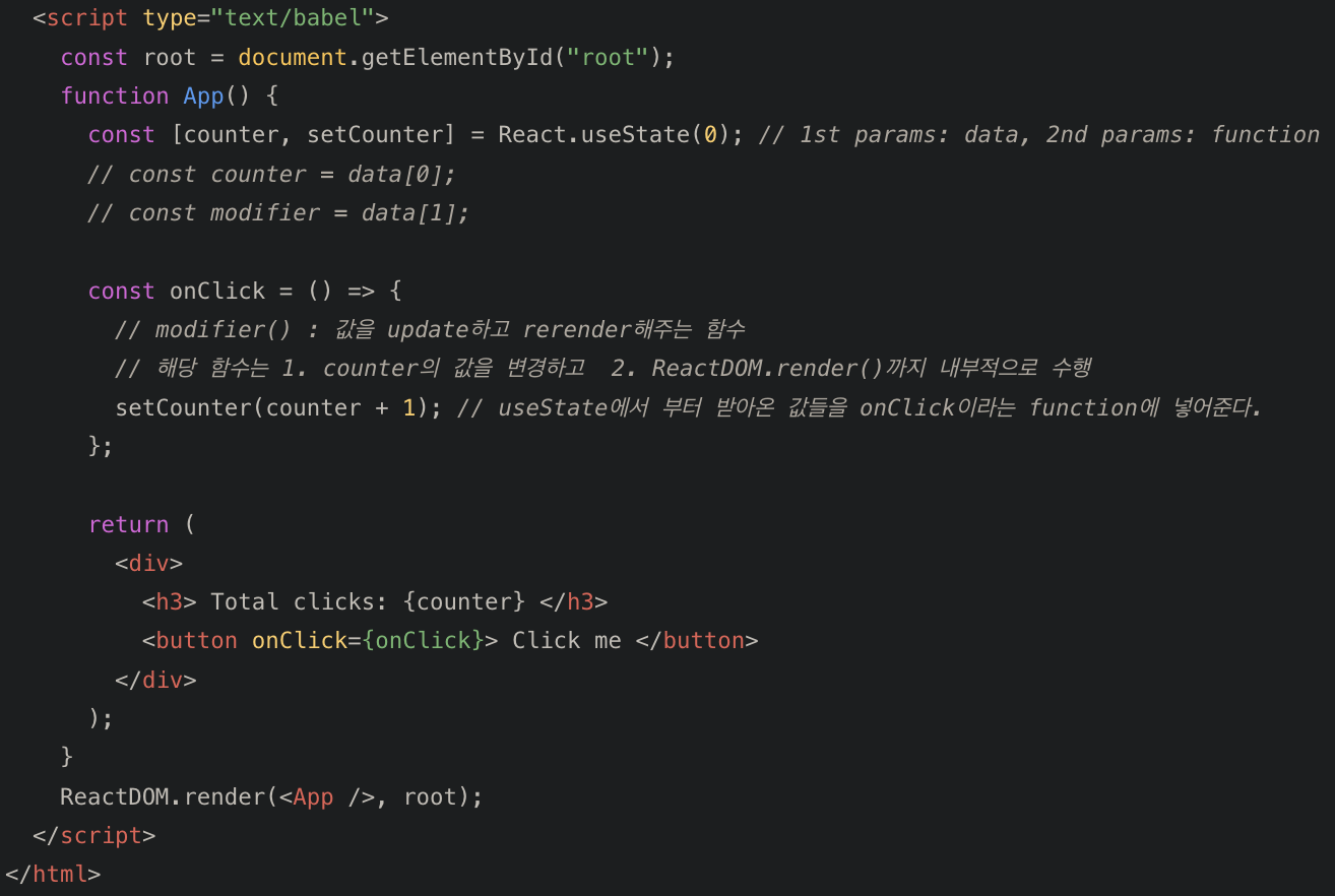 setCounter(counter + 1); // useState에서 부터 받아온 값들을 onClick이라는 function에 넣어준다.