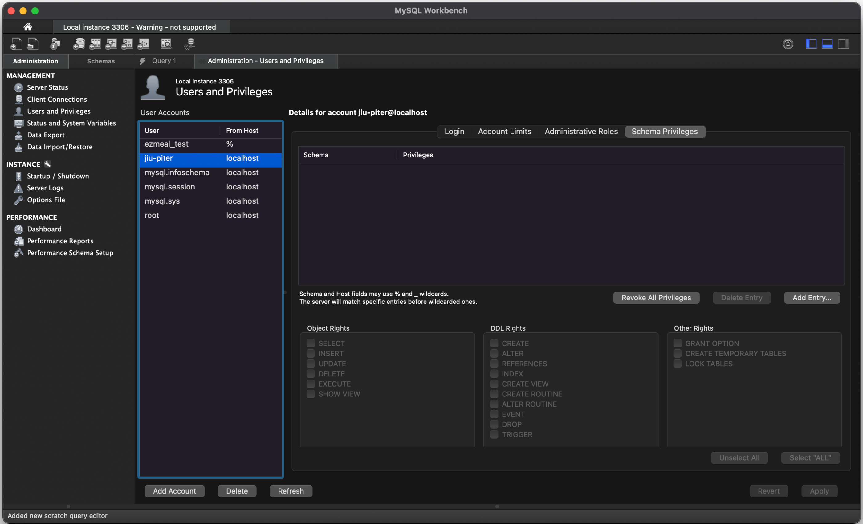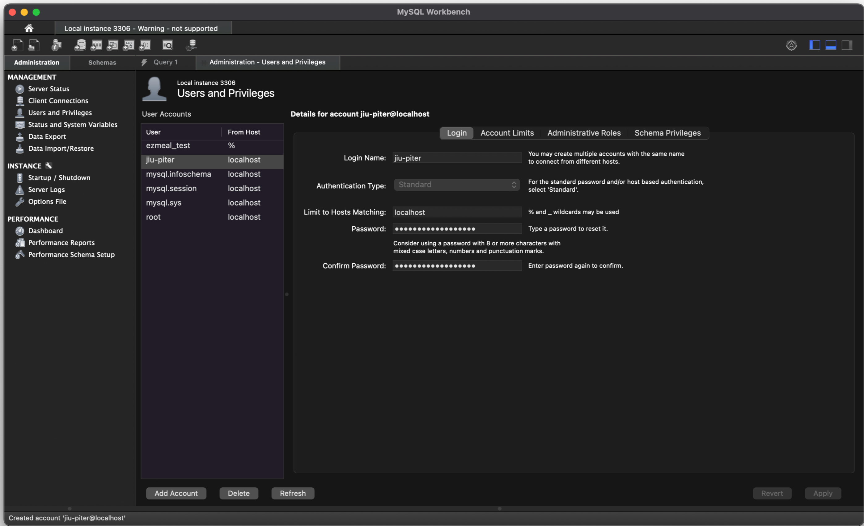 - 좌측 nav: MANAGEMENT -> User and Privileges