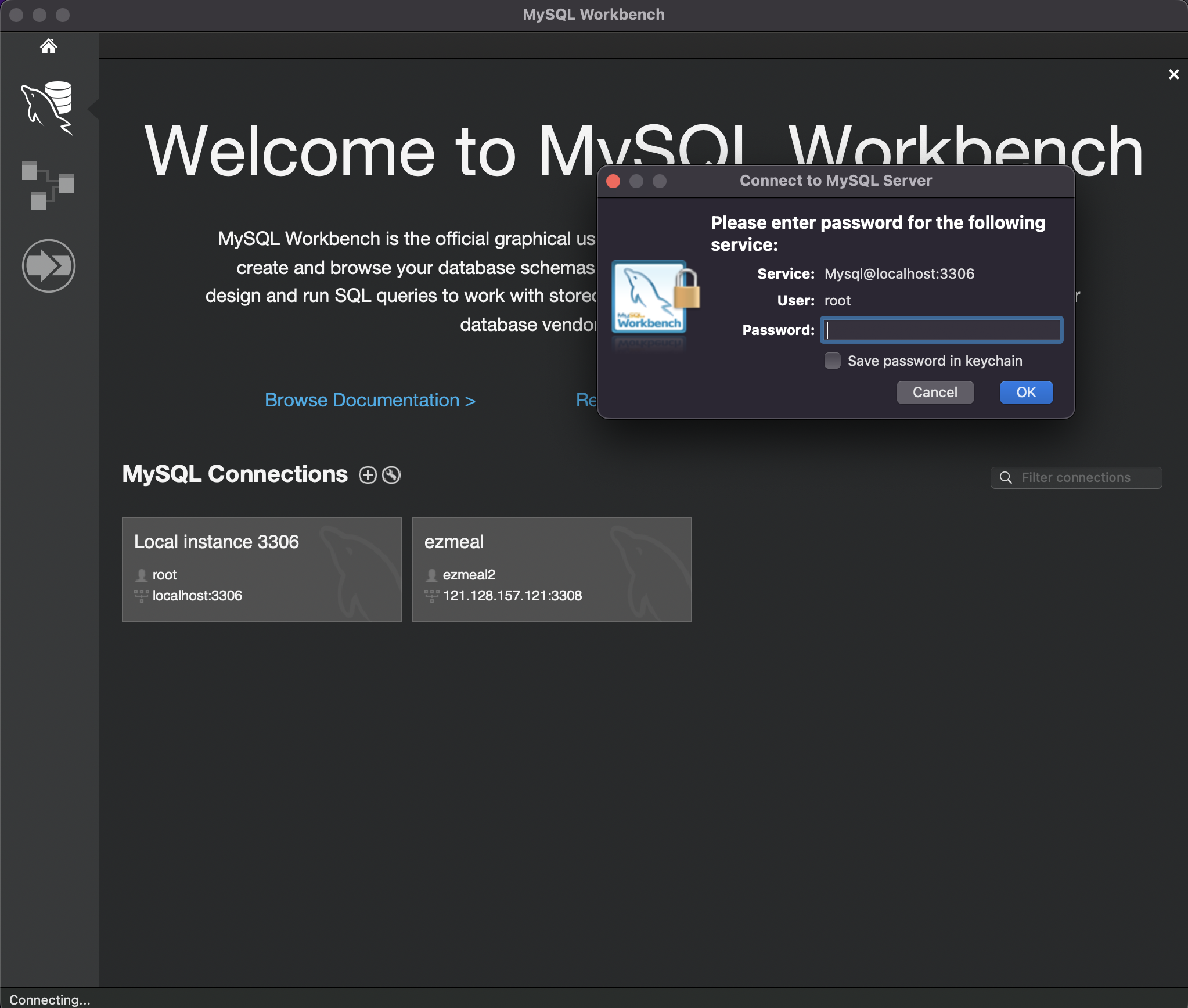 - cli 환경에서도 가능하지만 절차가 조금 복잡해서 실수할 가능성이 높기 때문에 MySQLWorkbench 이용