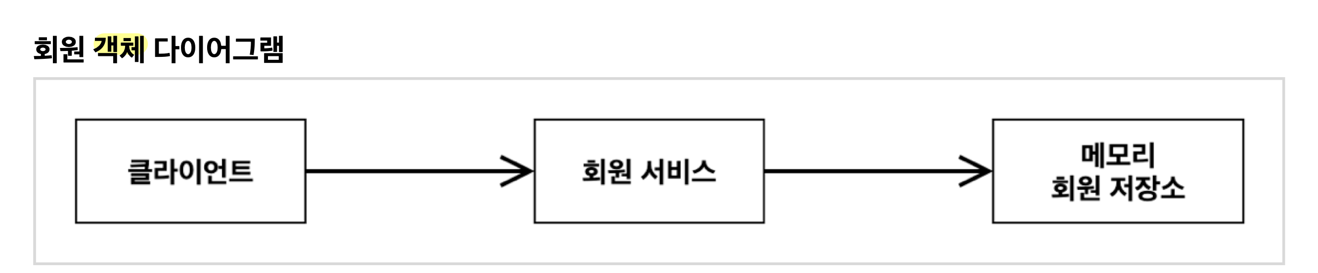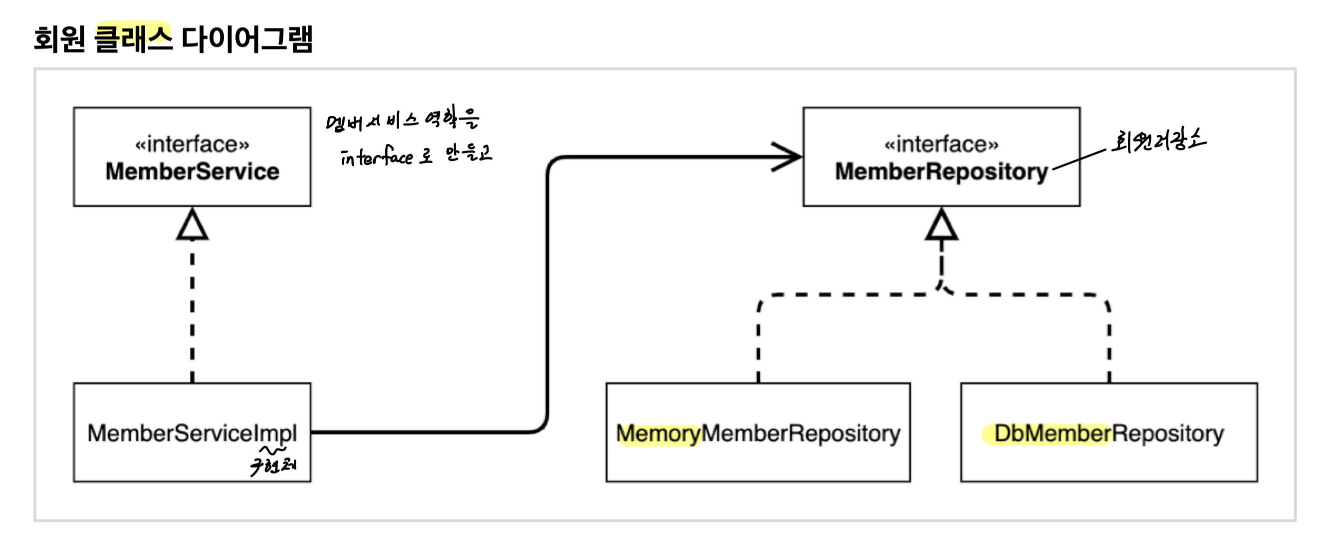 - 회원 가입 목록 -> 회원서비스(가입, 조회) -> 회원저장소(메모리저장소, DB저장소, 외부 시스템 연동 회원 저장소)