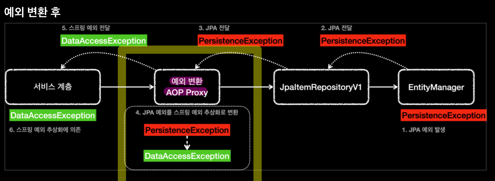 - 예외 변환 AOP 프록시는 JPA 관련 예외가 발생시 JPA 예외 변환기를 통해 발생한 예외를 스프링 데이터 접근 예외로 변환