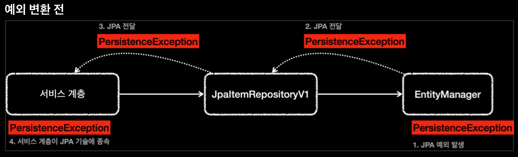 - JPA는 persistenceException과 하위 예외를 발생시킨다. + IllegalStateException, IllegalArgumentException 발생시킴