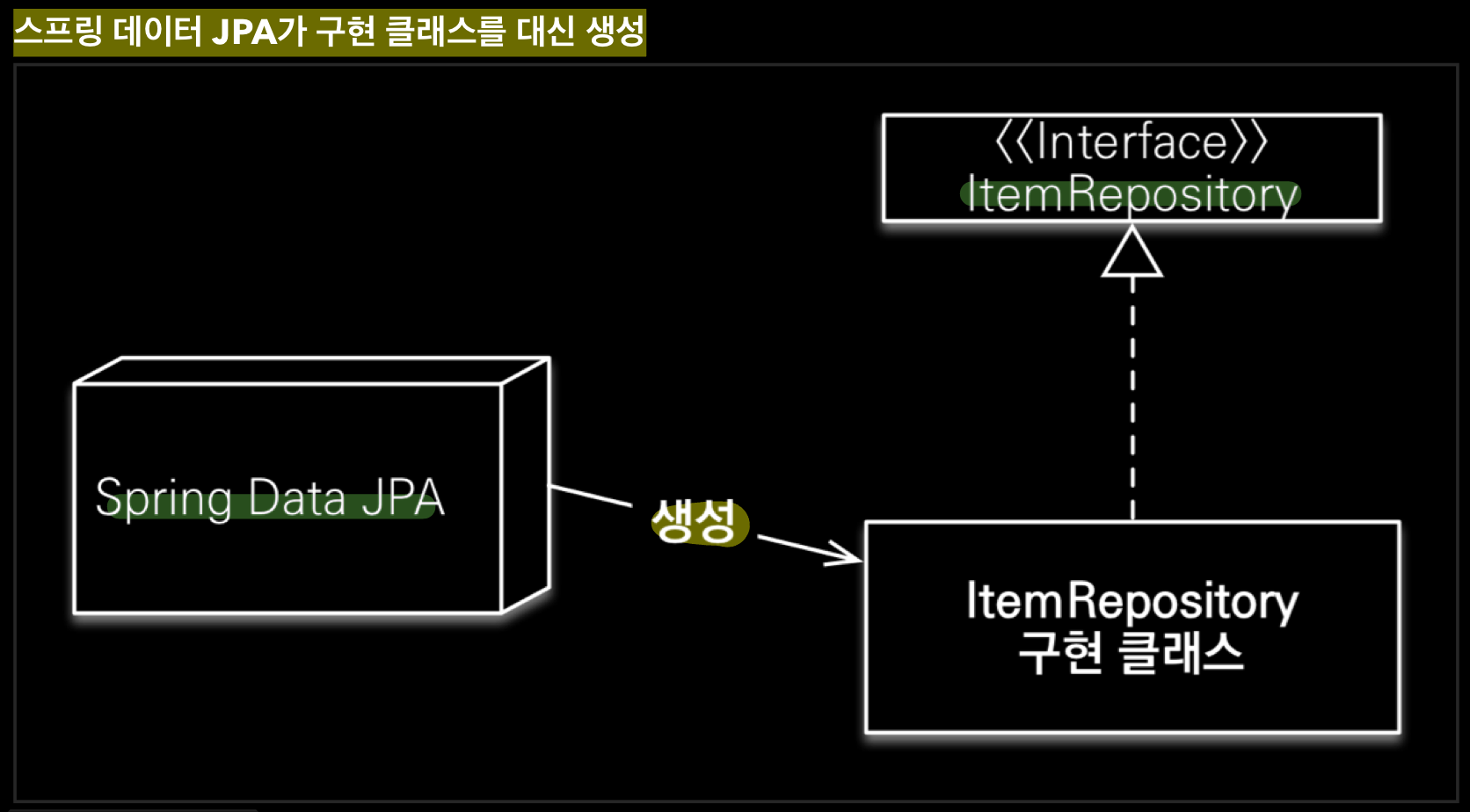 - JpaRepository 인터페이슴나 상속받았지만 spring data JPA가 프록시 기술을 사용해서 구현 클래스를 만들고 만들어진 구현 clss를 @Bean으로 등록해준다.