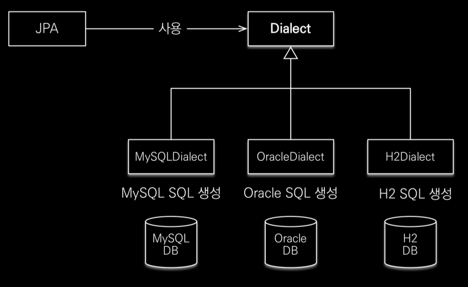 - JPA는 특정 db에 종속 X - db는 밴더마다 제공하는 sql 문법과 함수는 조금씩 다르다.