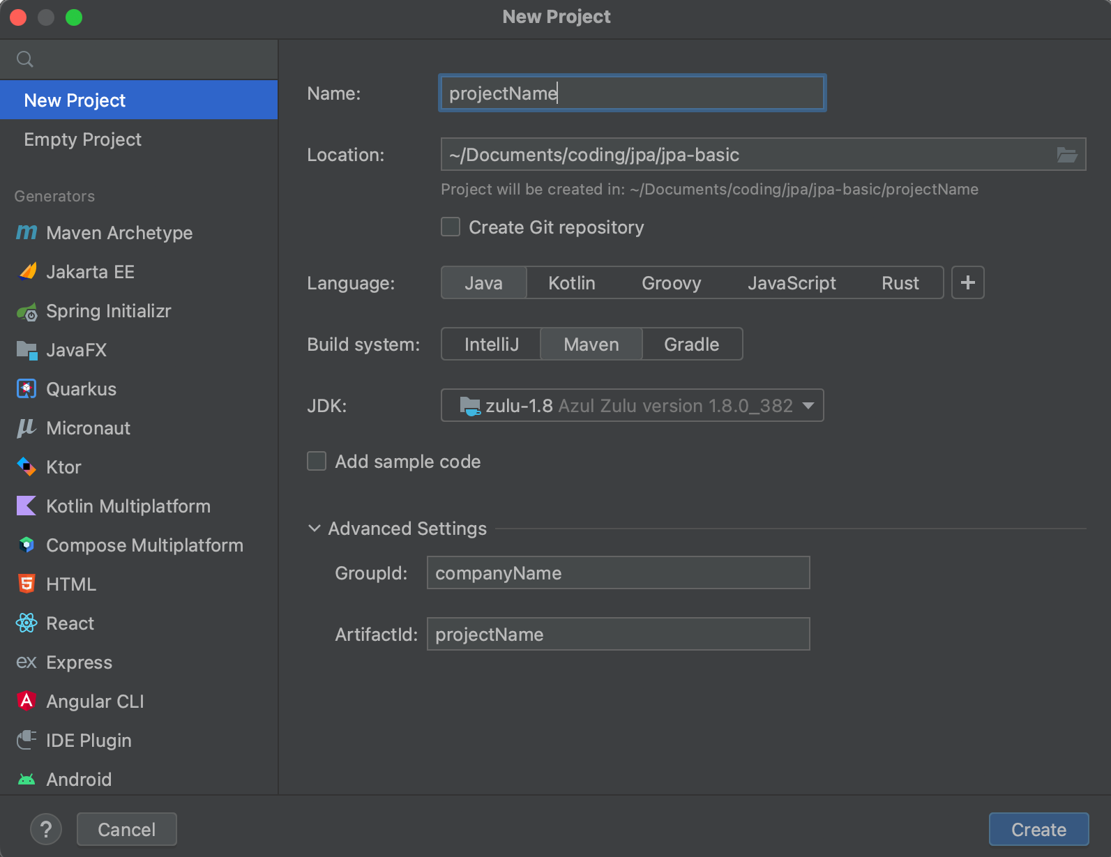 - New Project -> (좌측 배너 건들이지 않기) name, Language, Build system, JDK, GroupId, ArtifacId 작성 후 create