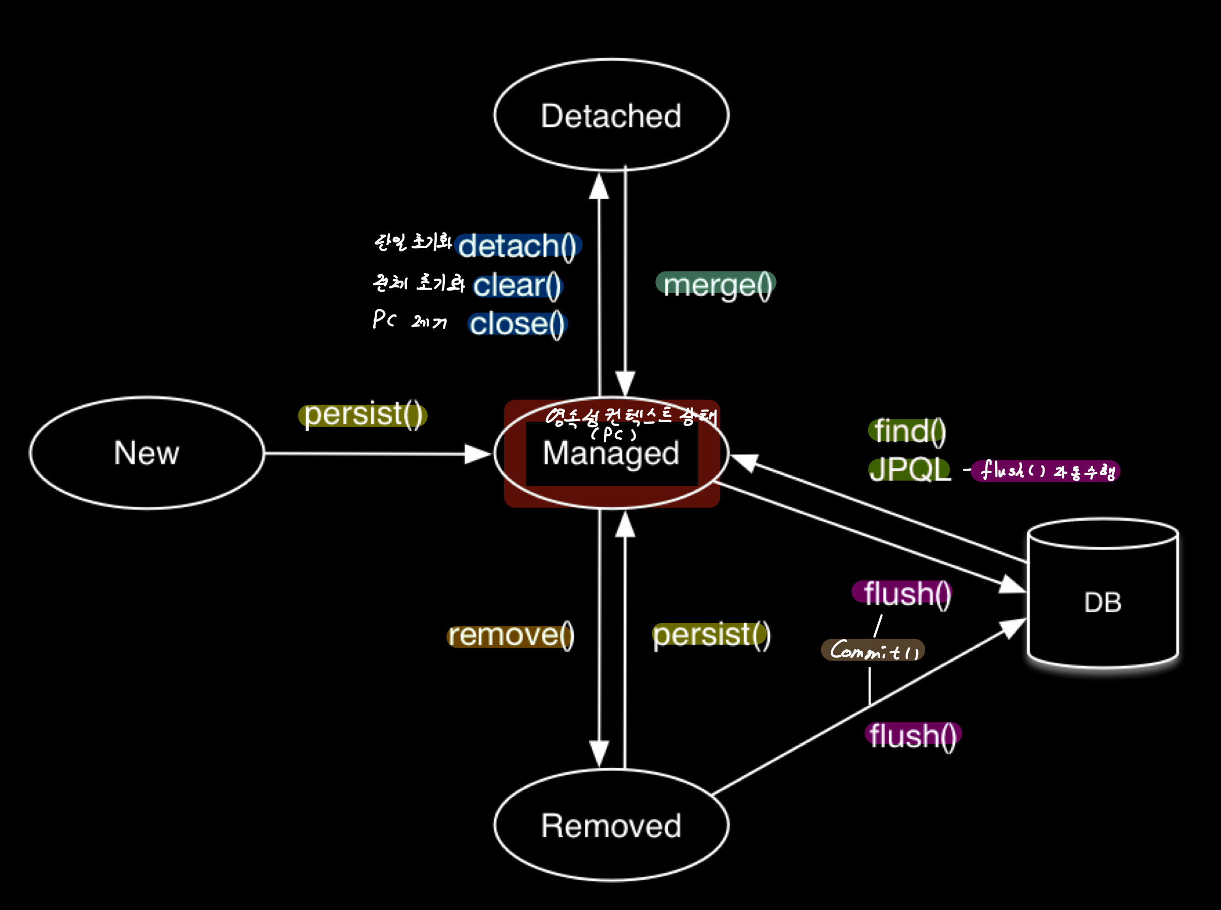 - 영속 (managed) : 영속성 컨텍스트에 관리되는 상태
