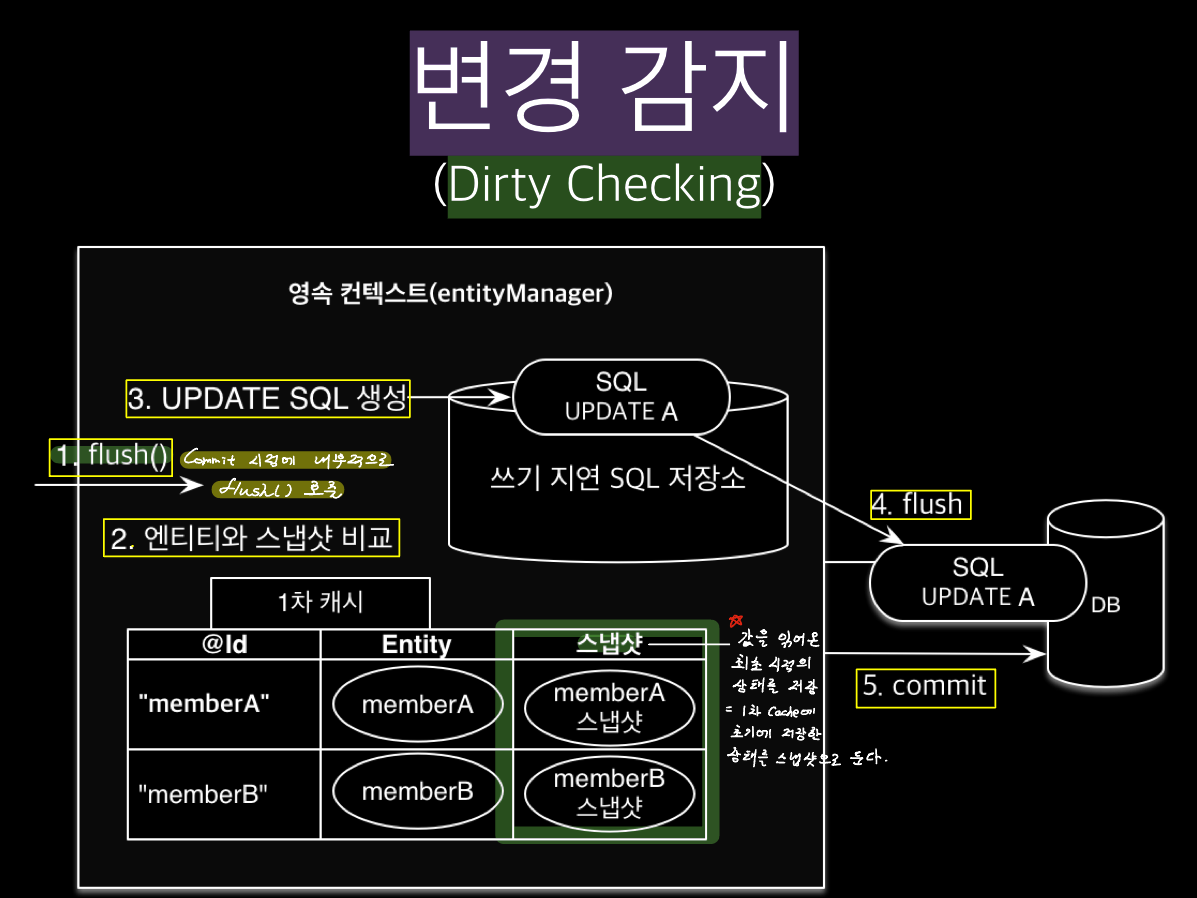 * 달라진 것이 존재 시 쓰기 지연 sql 저장소의 쿼리를 db로 보내주는 역할 까지만 수행
