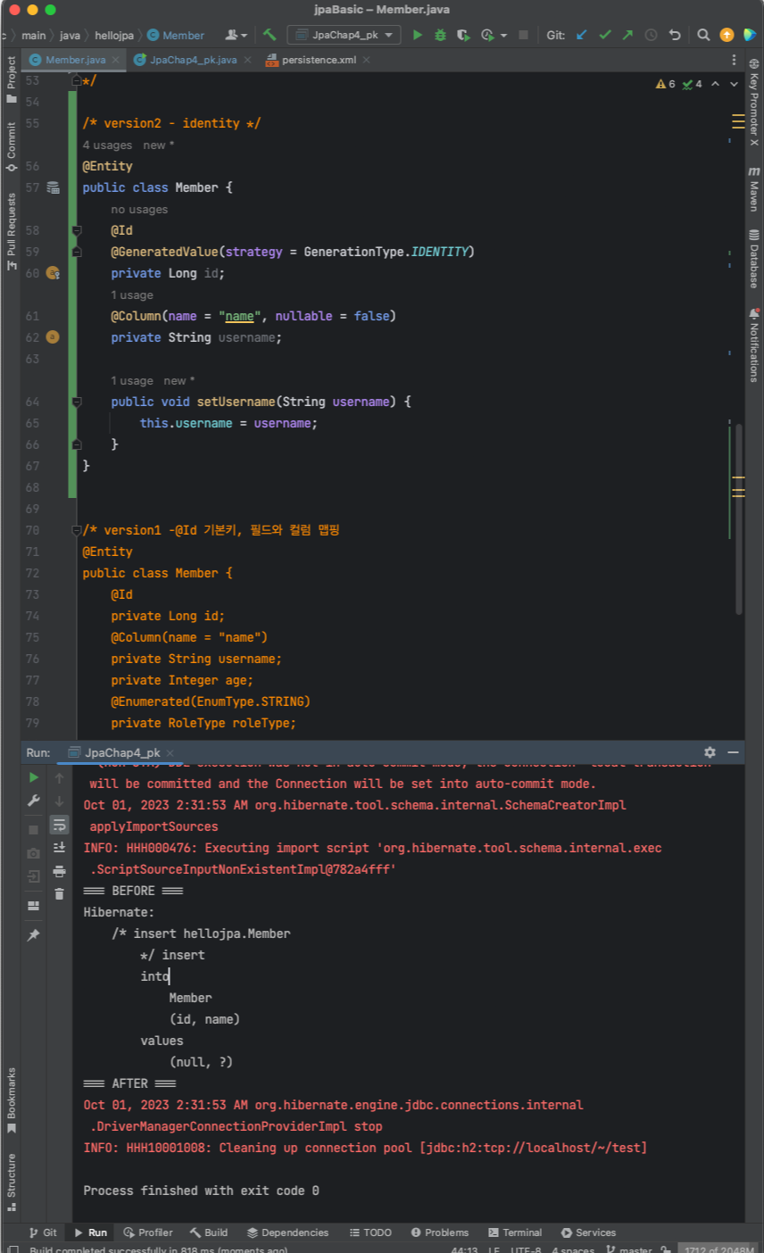- 하지만 identity 전략은 insert 시 Pk에 null을 넣은 상태로 sql을 db에 주고 db 내부에서 Pk 값을 만들어서 insert를 수행한다.