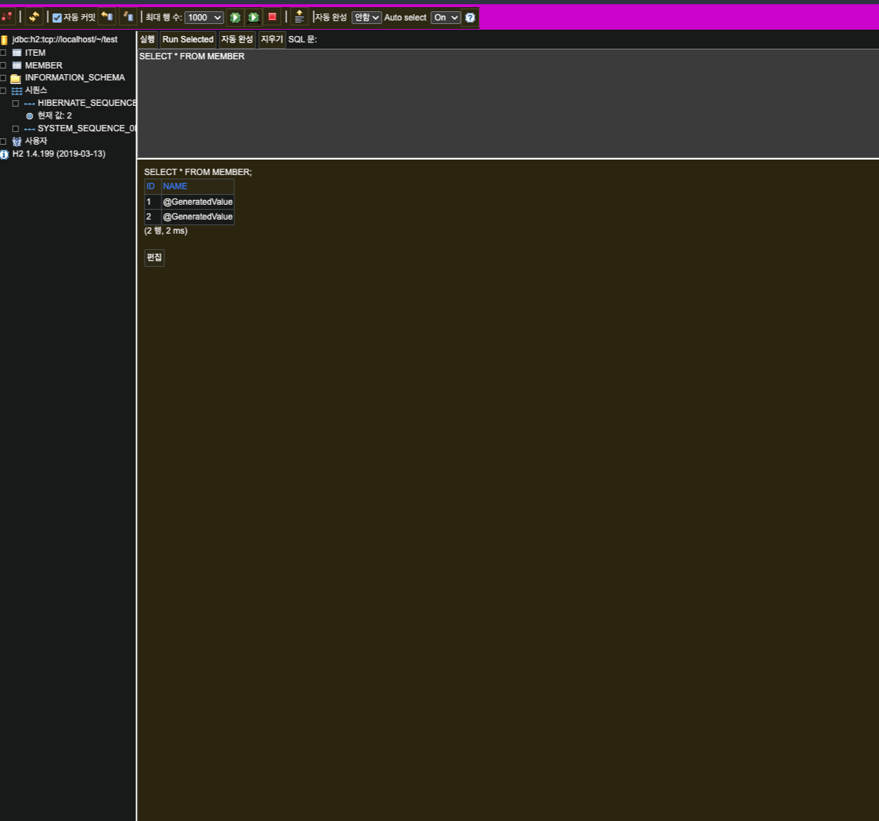 | sequenceName | 데이터베이스에 등록되어 있는 시퀀스 이름 | hibernate_sequence |