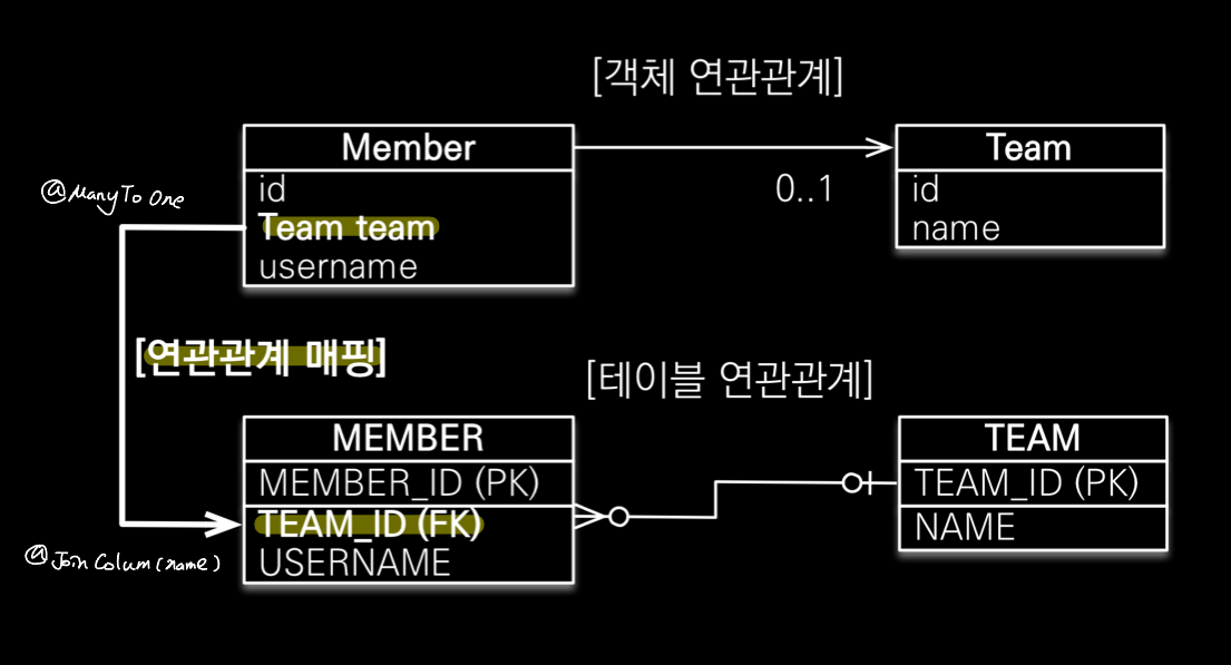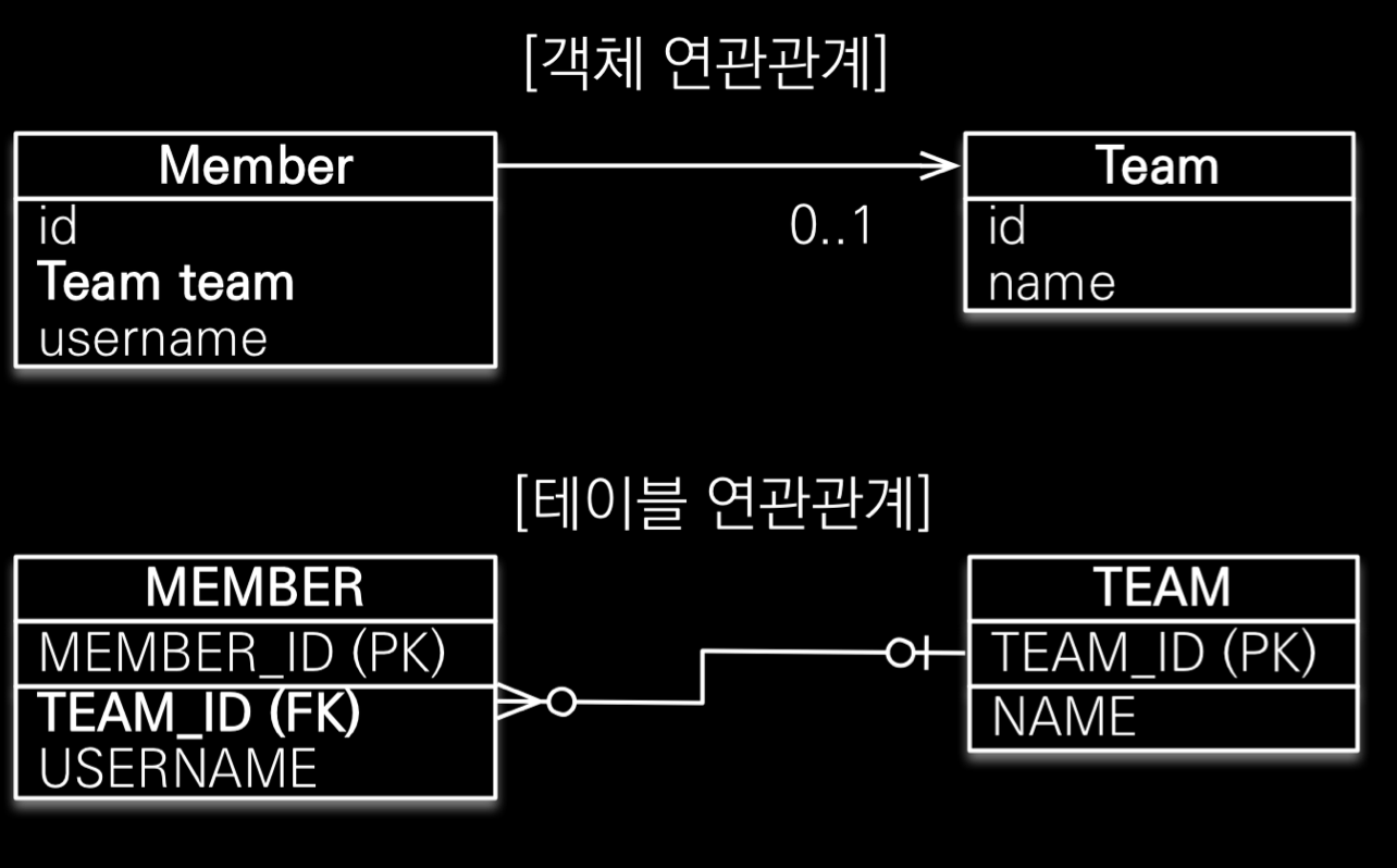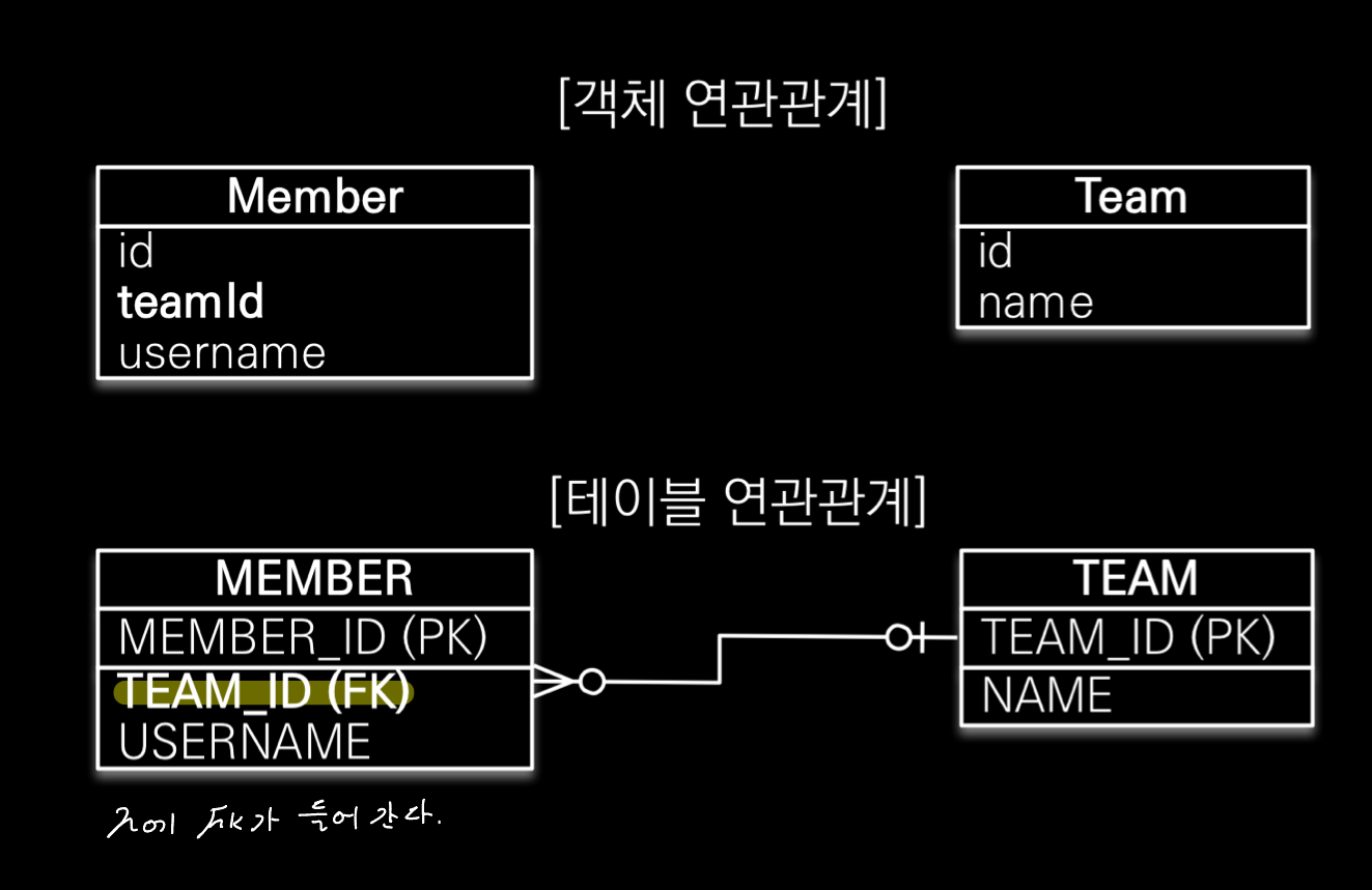 - 주인을 db의 fk로 넣을 것 객체에는 team이란 참조가, table에는 team의 pk 가 fk로 저장 (jpa가 해줌) - 연관관계의 주인만이 외래키를 관리 (등록, 수정, 읽기)