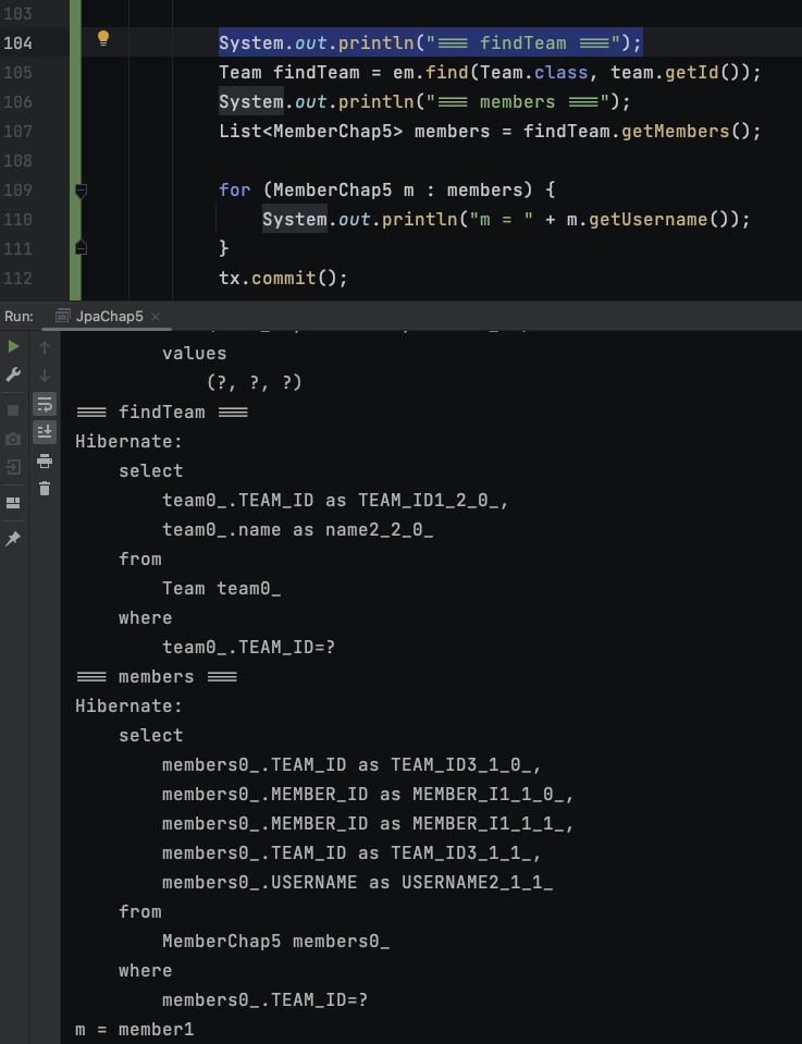* 참고로 4. 은 MemberChap5, Team 엔티티에 편의메서드를 만들어서 코드를 생략 - 편의 메서드는 상황에 맞춰 필요한거 1개만 만들어서 쓸 것. 둘다 쓰면 안됨
