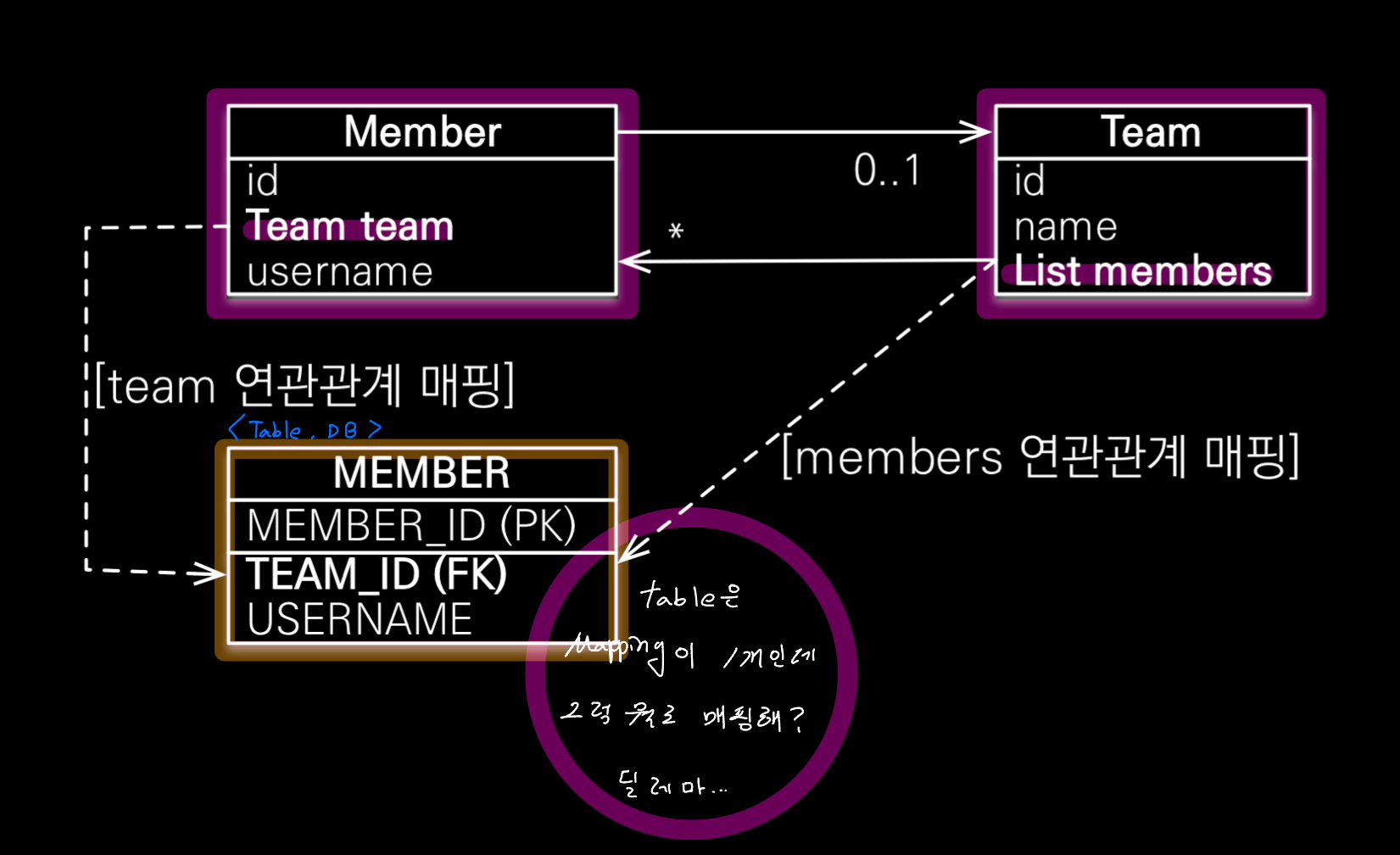 * : team은 Member 엔티티 내부 team이란 필드와 연결됨을 의미