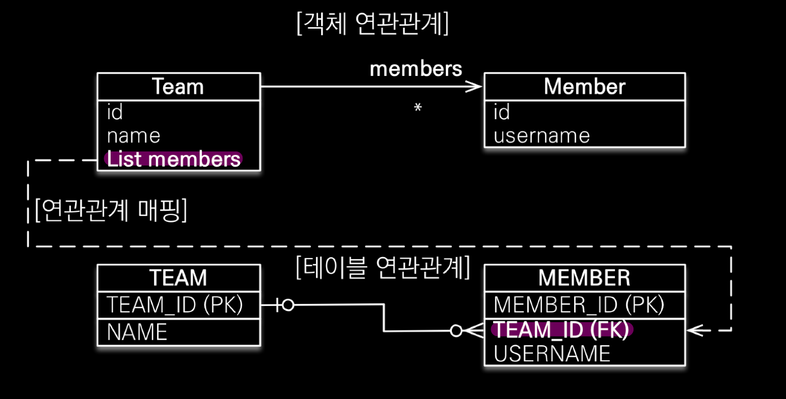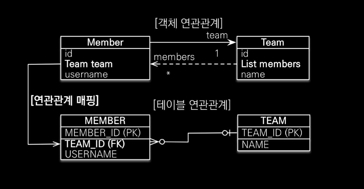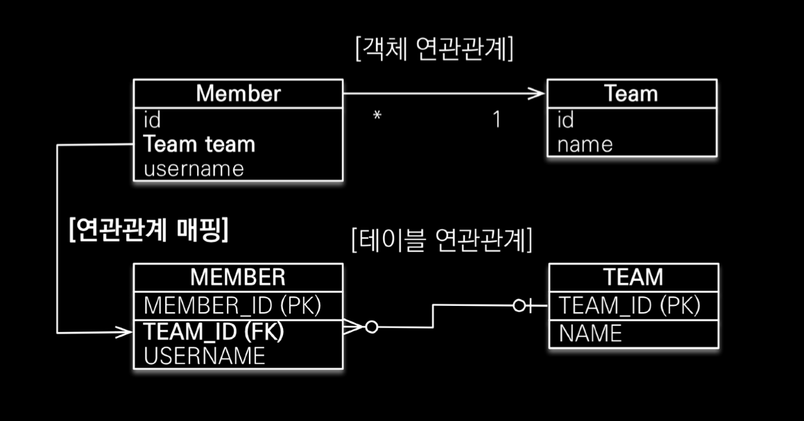 - 테이블은 외래 키 하나로 두 테이블이 연관관계를 맺음