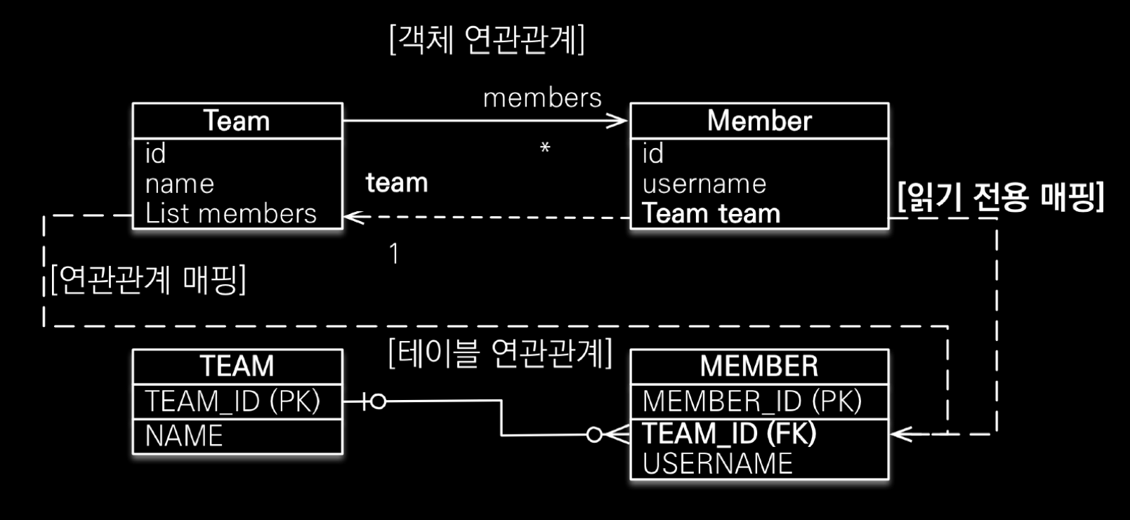 - 주인의 반대편: 외래 키에 영향을 주지 않음, 단순 조회만 가능