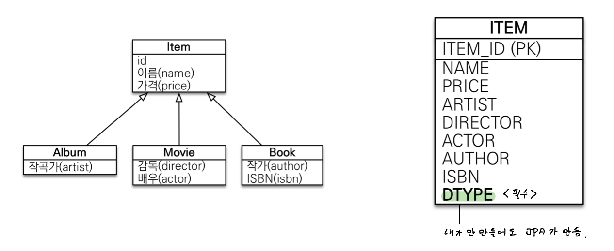 - @DiscriminatorColumn(name=“DTYPE”) 과 @DiscriminatorValue(“XXX”)는 Join 전략에 넣지 않아도 되지만 넣는 것을 권장, single_table에서는 필수