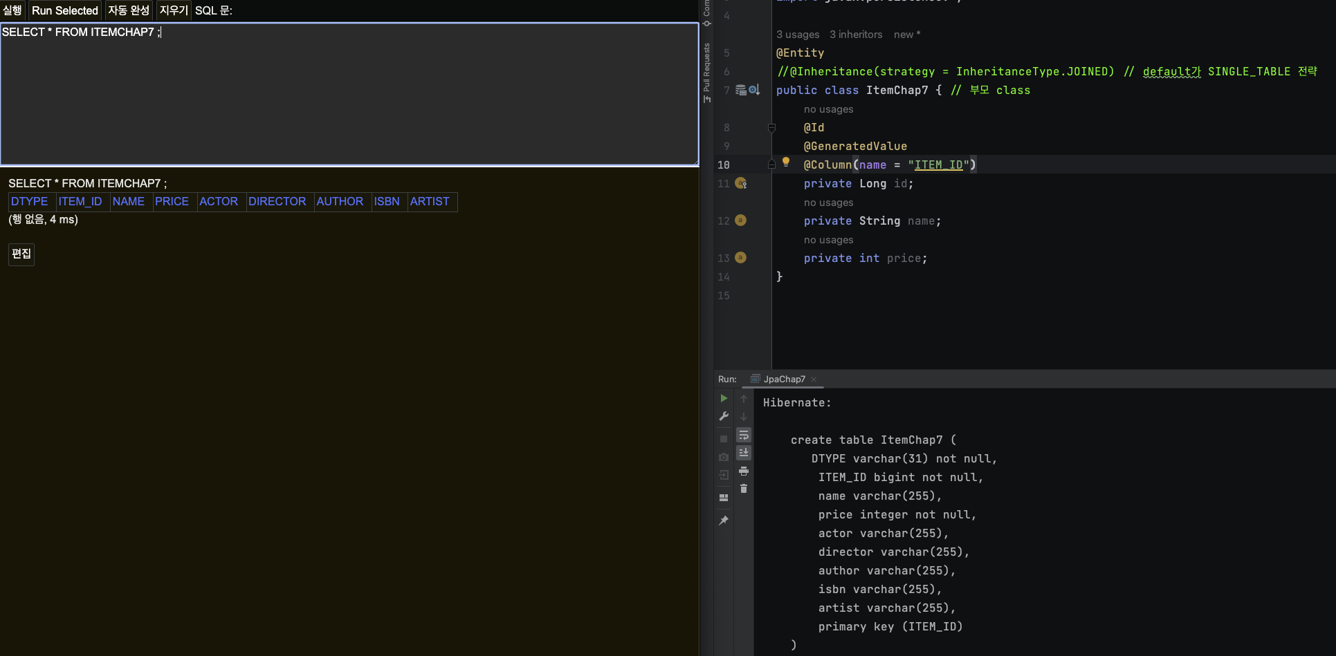 - SINGLE_TABLE: 단일 테이블 전략 (jpa default 전략) - @Entity와 extends만 있으면 default로 작동