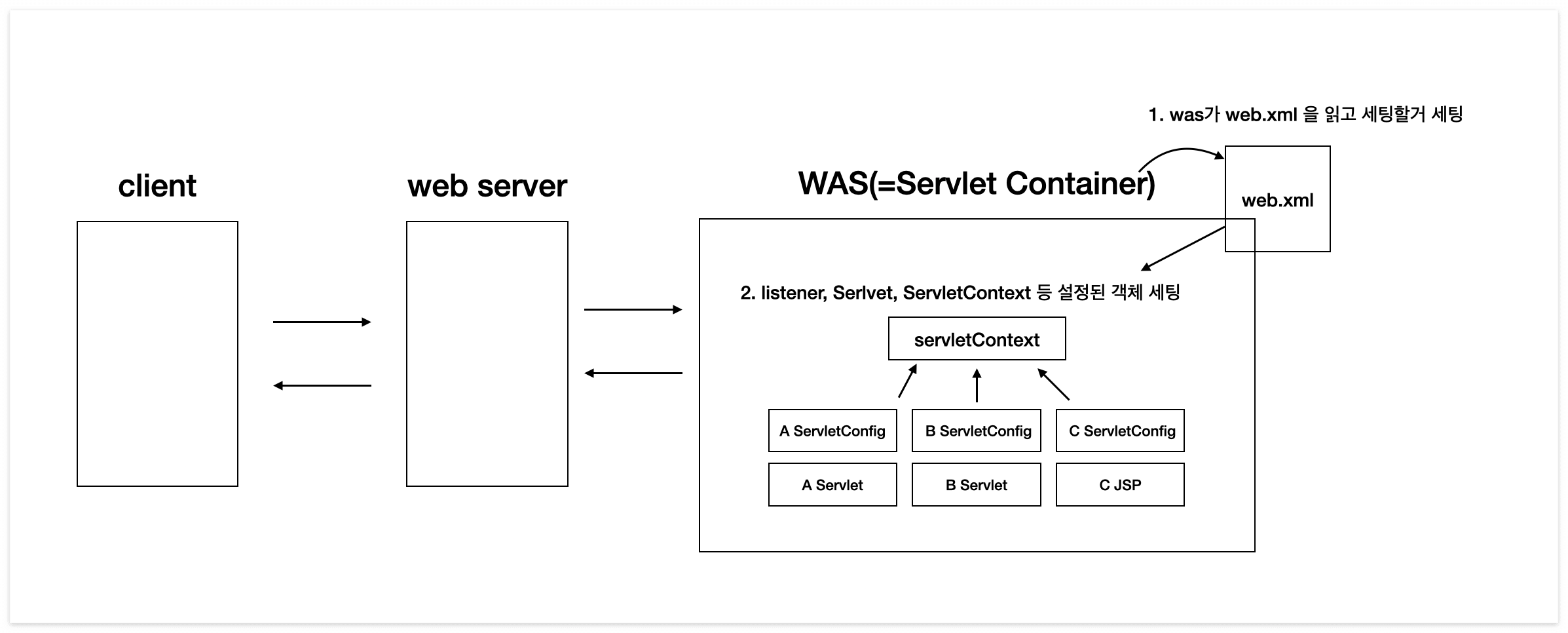 - servlet Container는 web.xml 내용을 바탕으로 Servlet Context 객체를 초기화