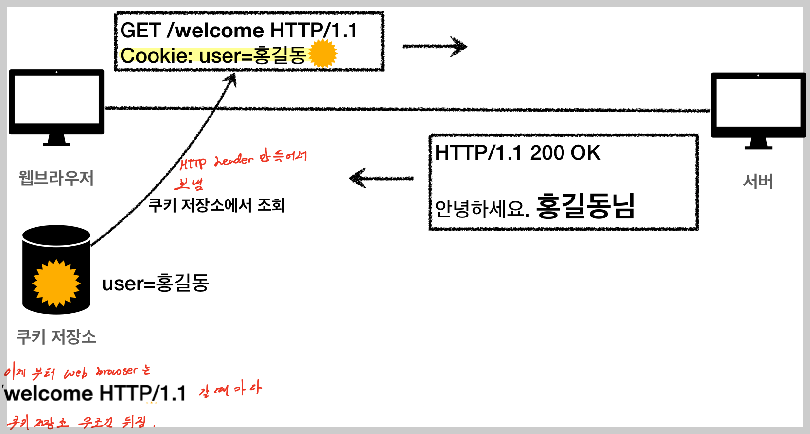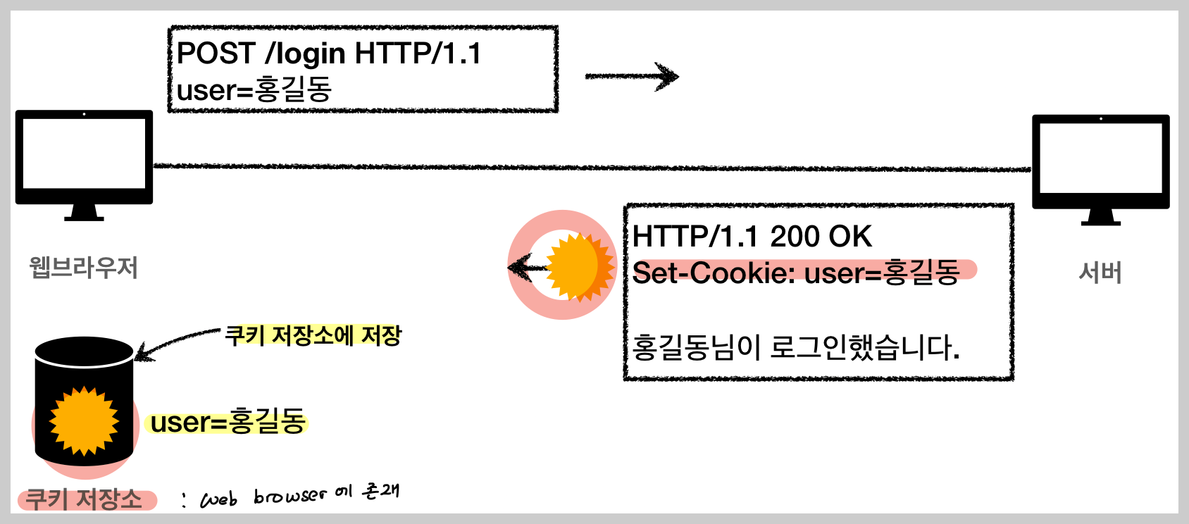 ex) 로그인 요청 -> Set-Cookie: user=woowee 헤더를 응답으로 보냄 -> web browser내에 존재하는 쿠키 저장소에 user=woowee 저장 -> 재요청 시작 -> web browser는 이제부터 먼저 쿠키 저장소부터 조회 -> 쿠키 존재시 - HTTP header(Cookie: user=woowee) 만들어서 요청에 같이 보냄 -> 서버가 이전 요청 기록 기억할 수 있음