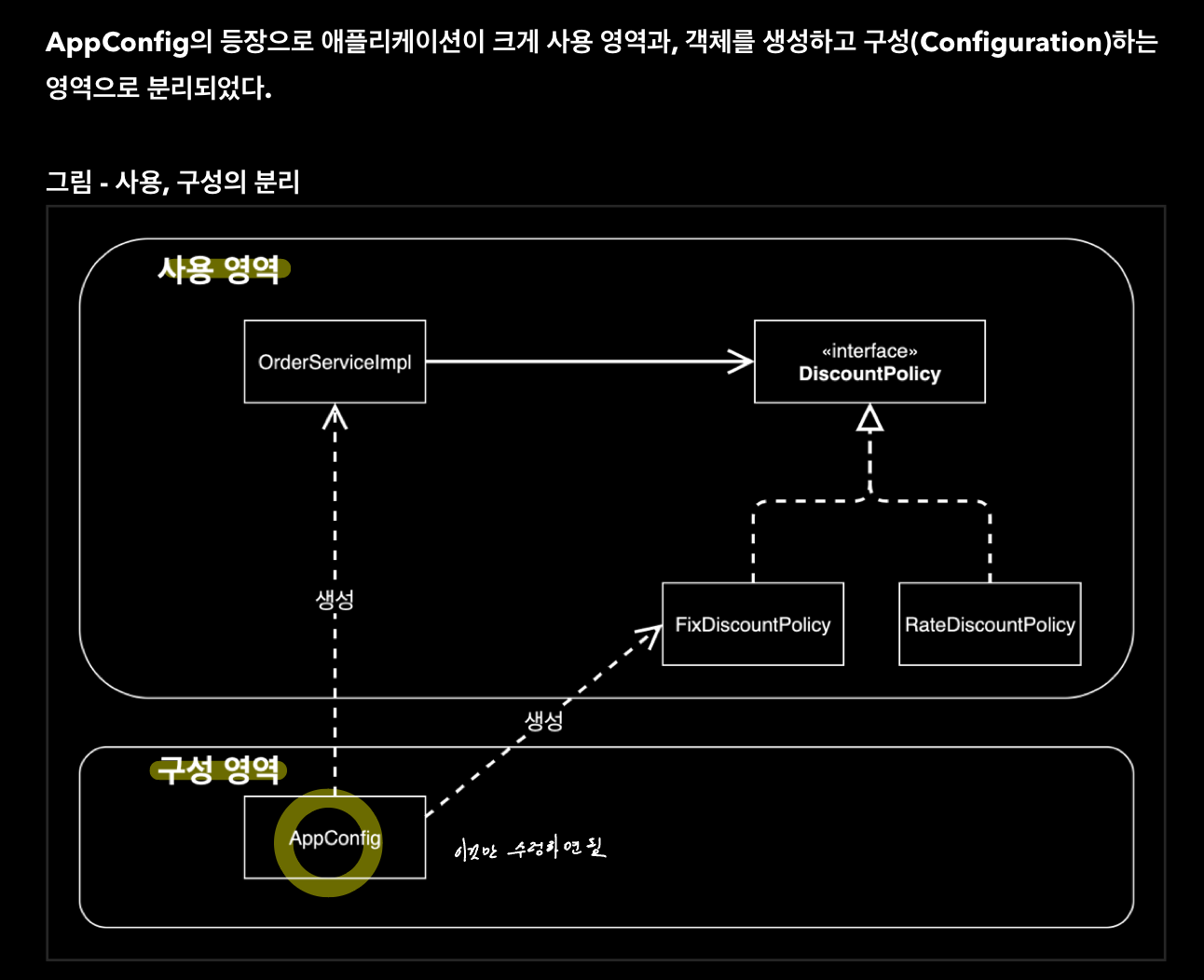 - 구현 객체를 생성하고 연결하는 책임은 AppConfig가 담당