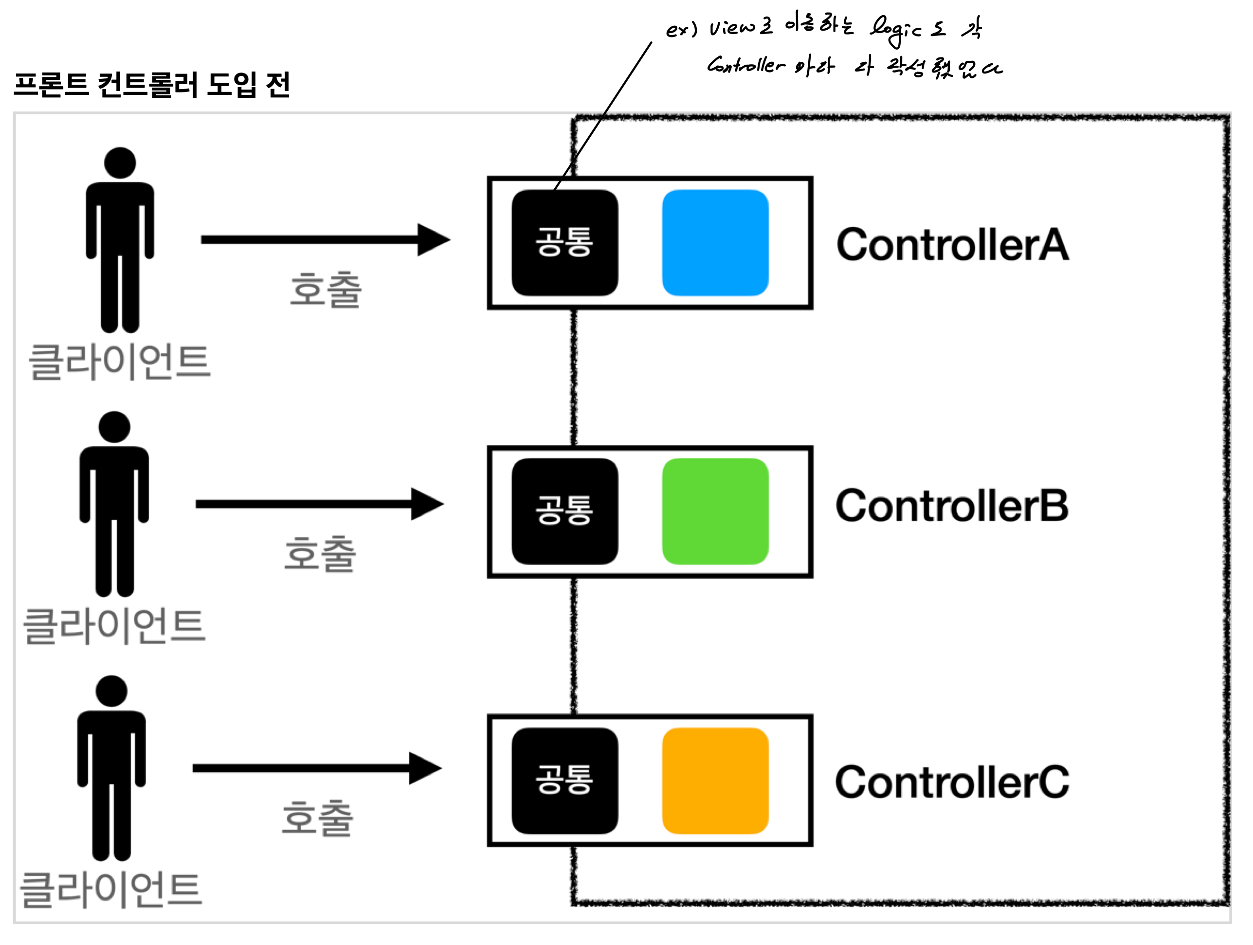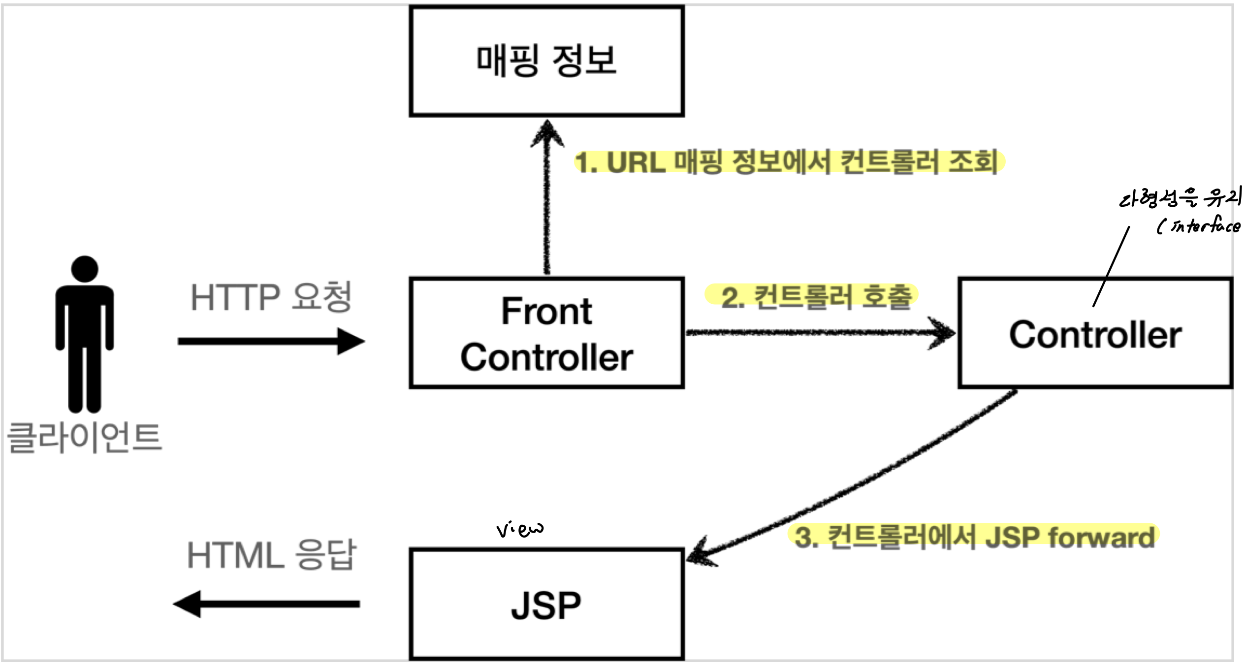 - FrontController servlet가 요청에 맞는 controller 찾아서 호출
