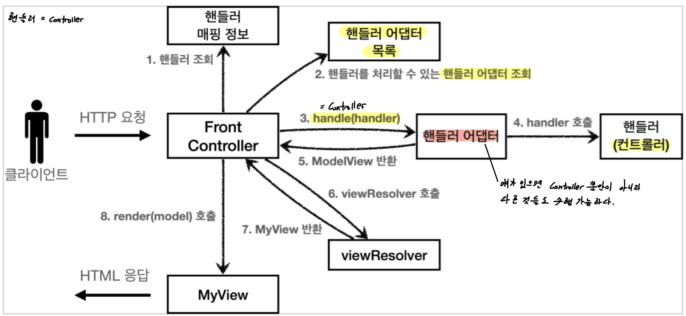 - adapter pattern으로 frontController는 여러가지 핸들러를 받을 수 있게 된다.