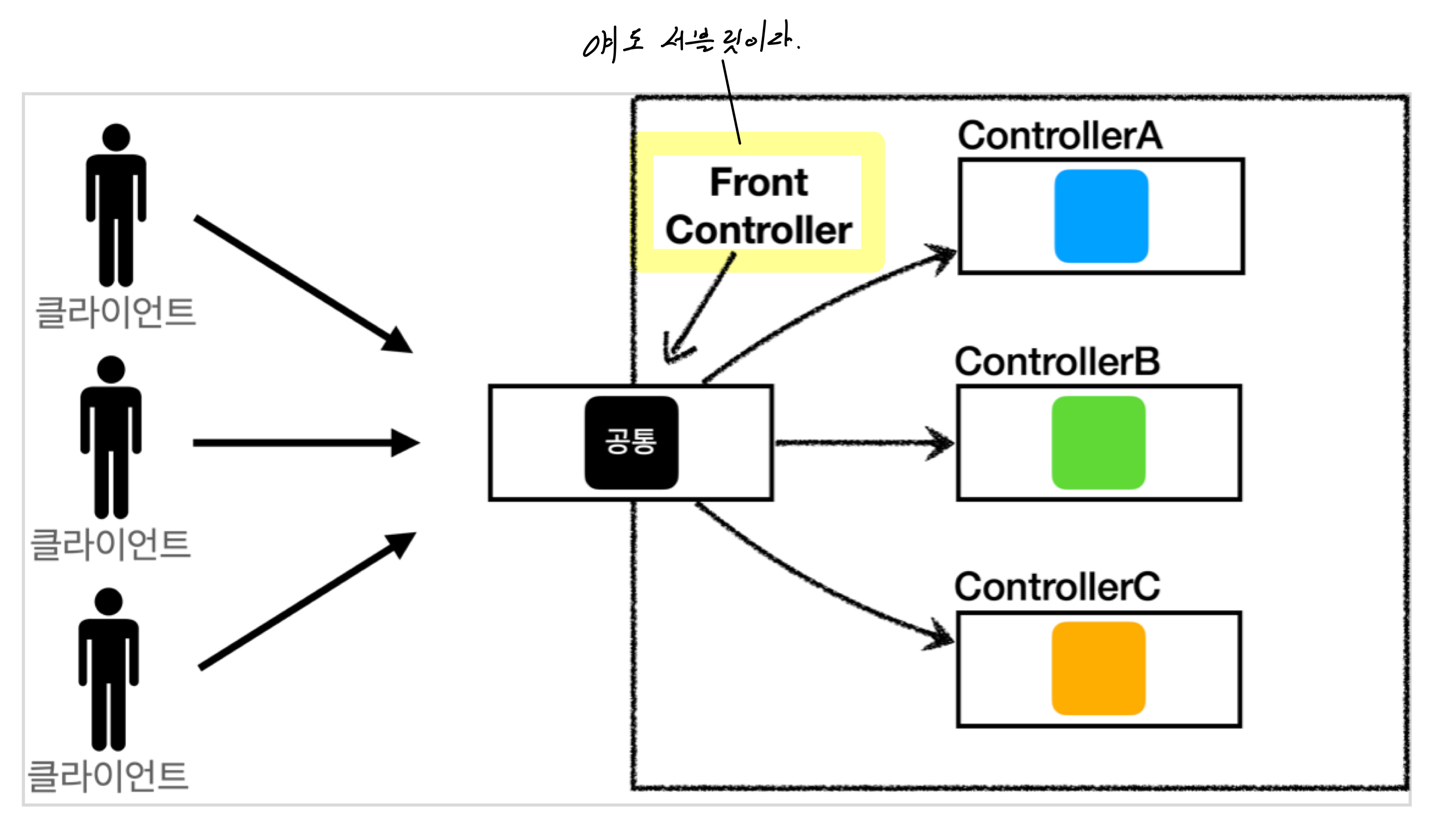 - FrontController servlet 하나로 모든 client 요청을 받는다.