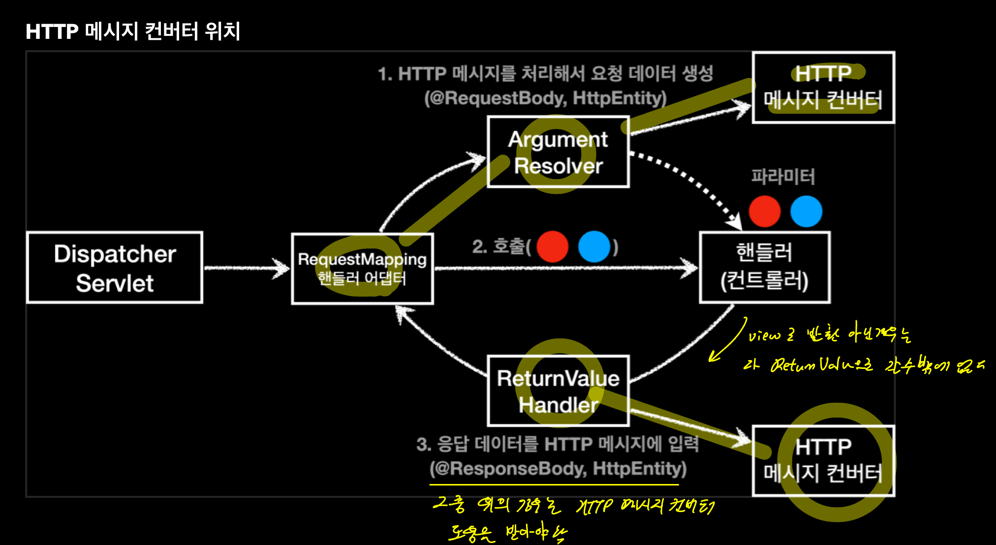 요청 params나 return 값은 디스패처 서블릿에 의해 정형화 되어있다. 각각의 케이스를 맞춤형으로 쓰려고 어뎁터가 존재하고 어댑터도 어느정도 정형화 되어있는데 요청의 경우 다양한 params를 다룰려고 argument resolver가 쓰이고 그중 @HttpRequestBody의 경우는 http 메시지 컨버터를 사용해서 params의 값을 만들어서 반환해줌