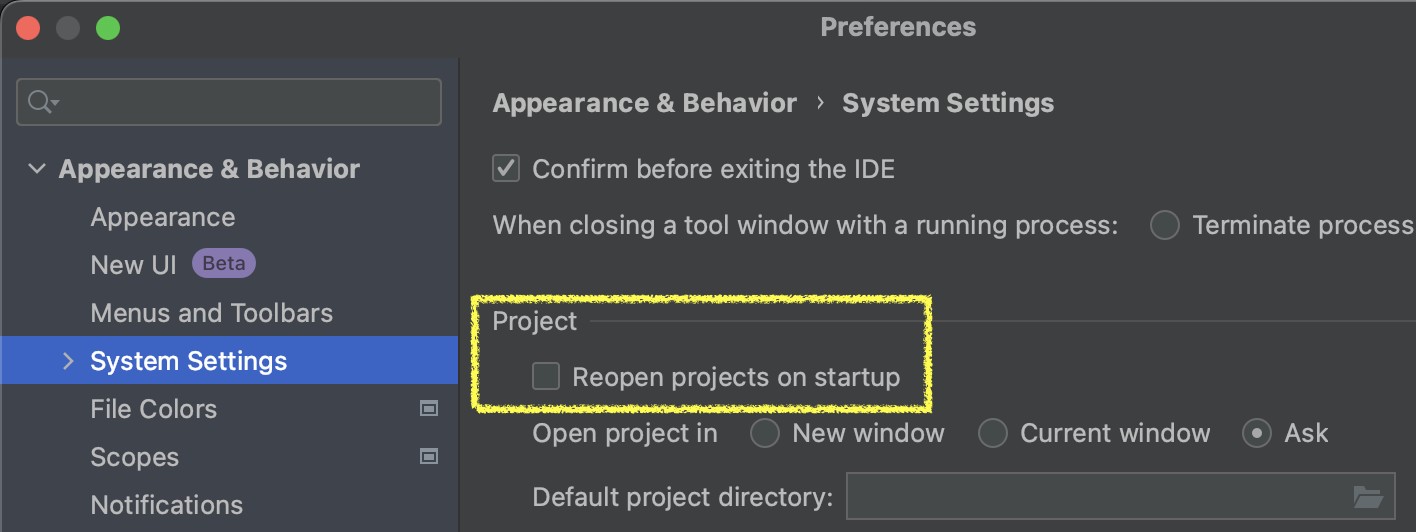 3. Project란의 Reopen projects on startup 체크해제 하기