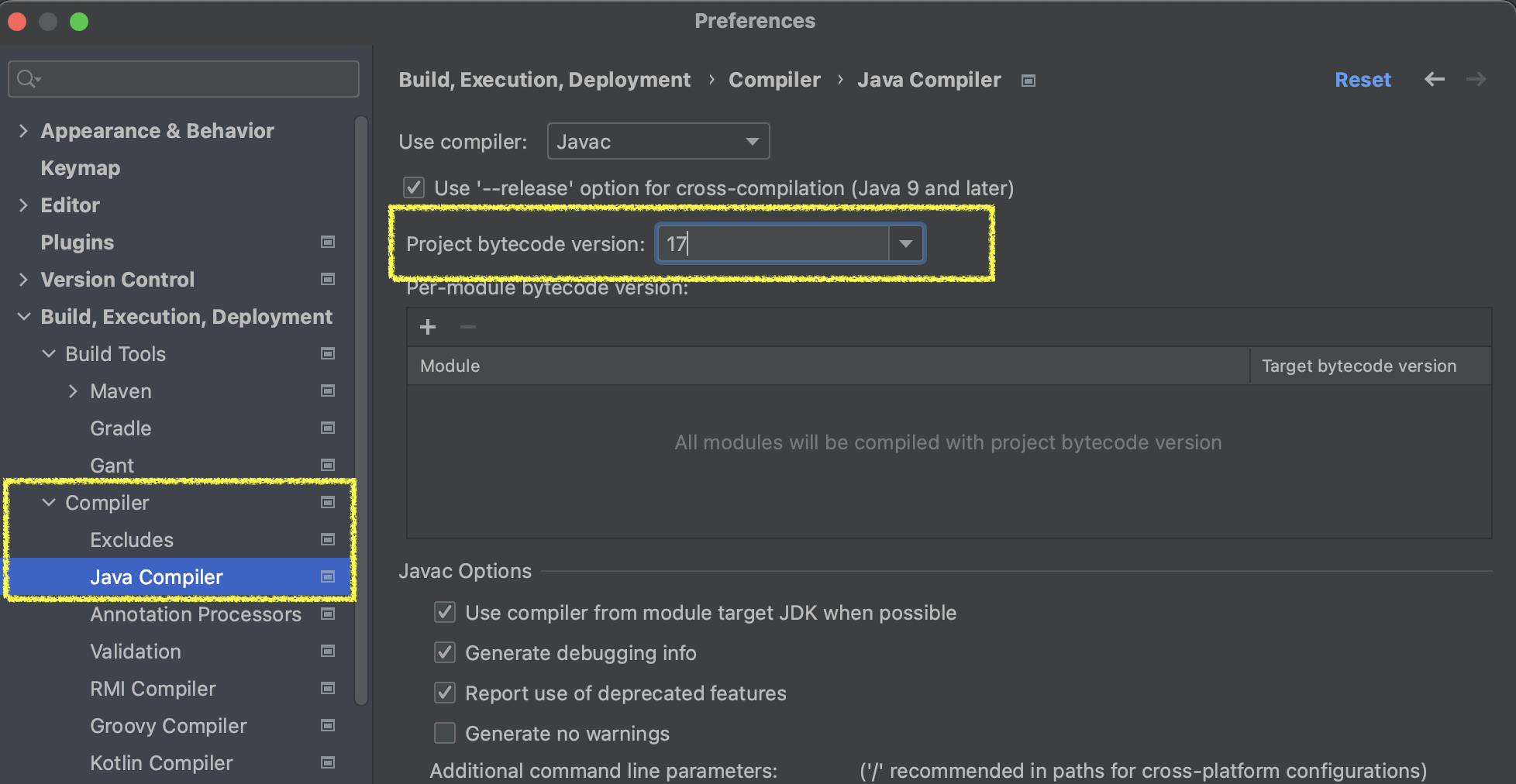- Build,Execution,Deployment -> Compiler -> Java Compiler