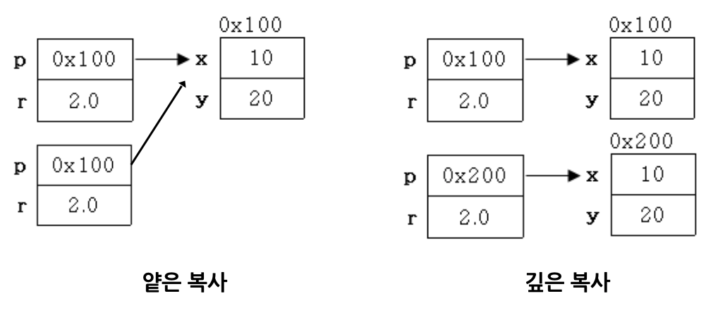 clone() _ 얕은 복사, 깊은 복사 clone() 인스턴스변수의 값만 복사하기 때문에 참조타입의 인스턴스 변수가 있는 클래스는 완전한 인스턴스 복제가 일어나지 않는다. 참조타입의 인스턴스 변수: 객체에 iv들이 존재하는데 iv 값이 다른 객체 주소를 가리키는 상황. 완전한 복제가 안된다는 의미: 객체까지는 복사가 됬는데 객체 내부의 iv가 가리기는 다른 객체는 서로 공유하는 상황 이와 같은 clone을 얕은 복사라고 한다. -> 서로 공유하는 객체가 존재하기 때문 clone() 사용 방법 clone의 얕은 복사로 인해 원본 객체에 영향을 끼치기 때문에 원본 보호 목적으로 특정 조건을 허용해야 clone()을 사용할 수 있도록 했다. implements Cloneable : interface 구현 접..